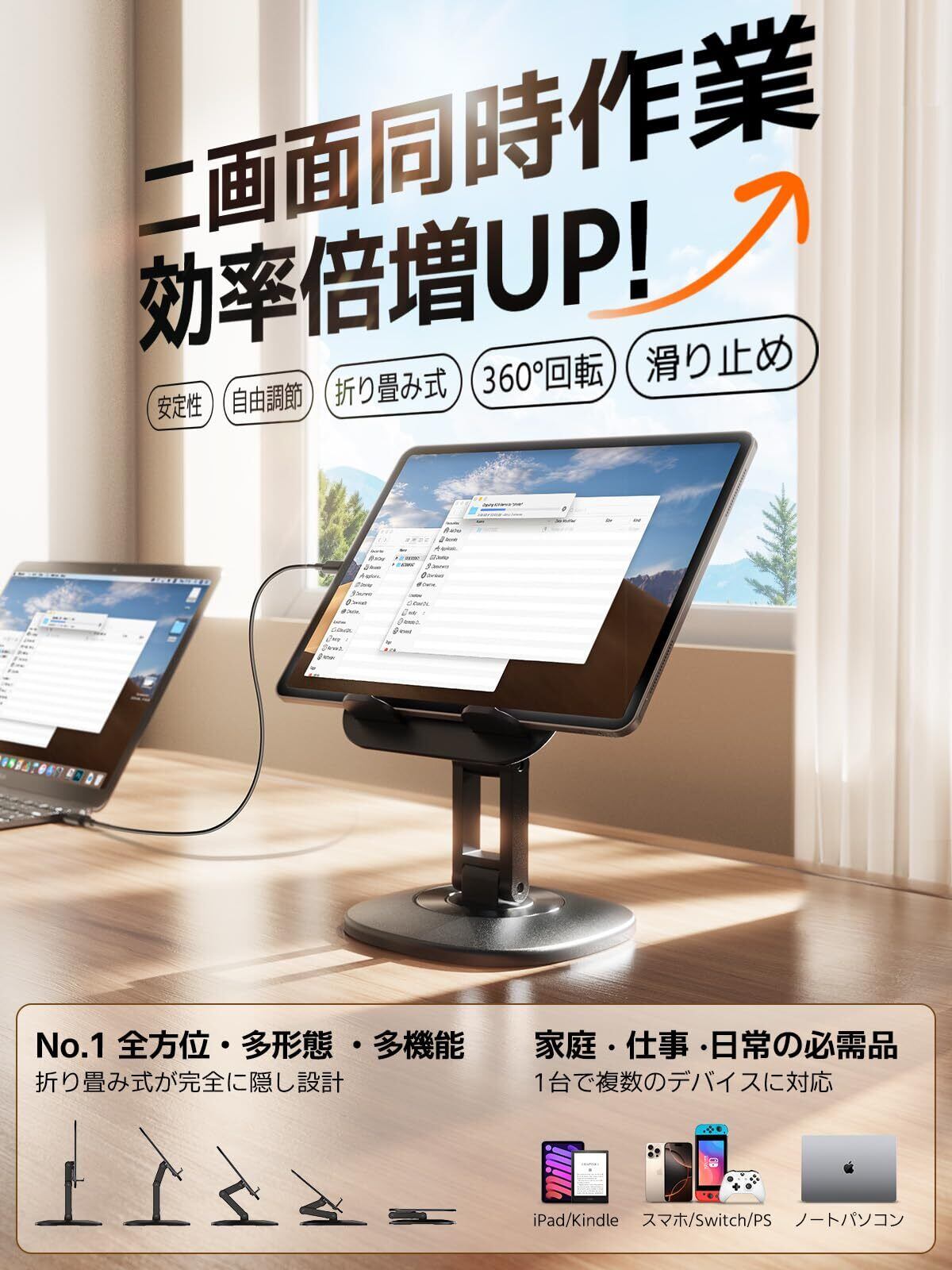 【特価商品】タブレット スタンド 【3Dプレミアム·角度調整+安定性 3軸】 ipad スタンド 隠し 折りたたみ スマホスタンド 360°回転 スマホホルダー 軽量小型 滑り止め iPad Pro/Air/mini/iPhone/Kindle/Macbook/Surface/スマホ 多機種対応 タブレットホルダー 家庭·仕事·日常·卓上·寝ながらの必需品+L型レンチ固定可能付き