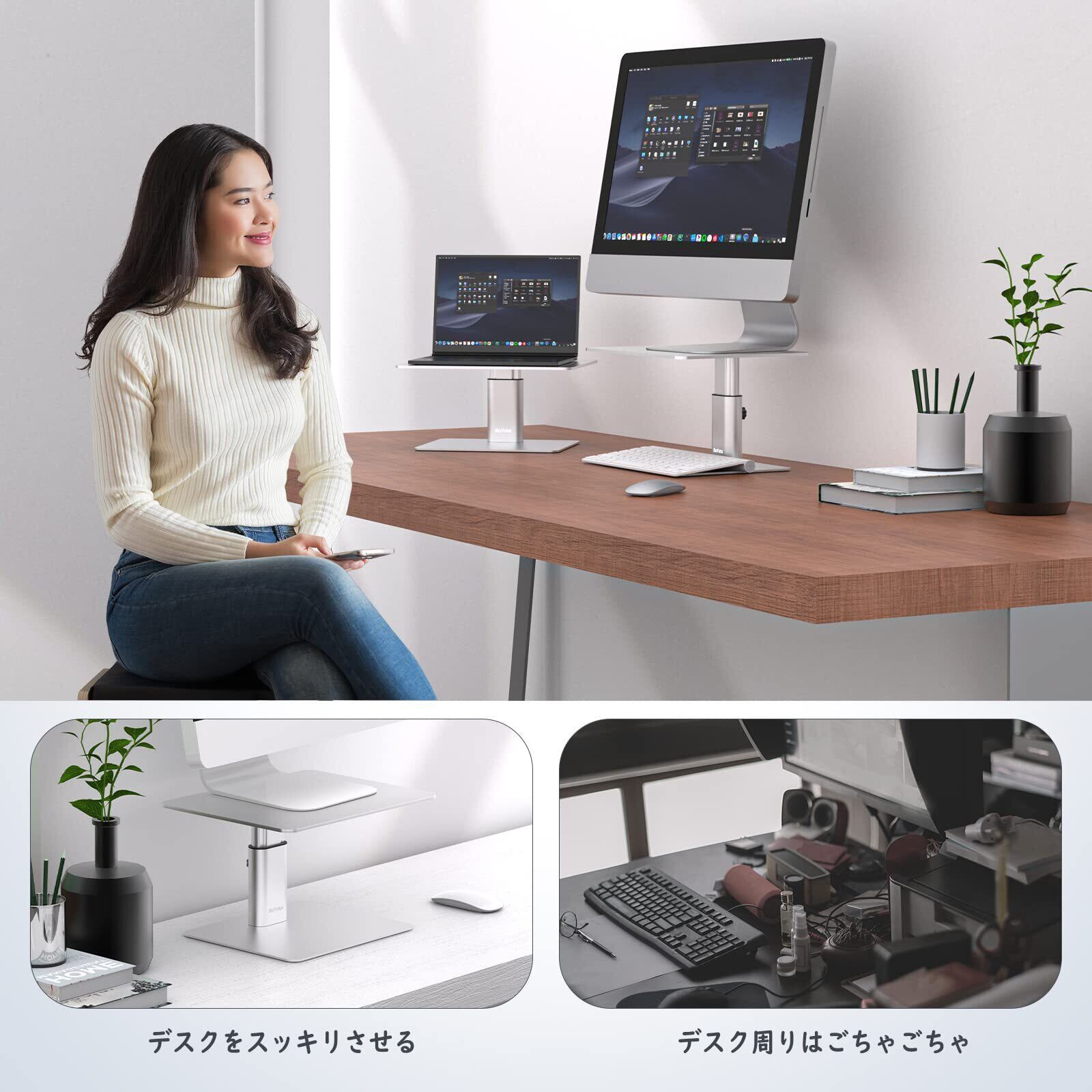 【幅広く互換性】デュアルモニター、PCモニター、パソコン、iMac、ノートPC、スピーカー、ディスプレイなどに幅広く対応可能なモニター台、机上台です。自宅、オフィス、寮やワークスペースへの追加に理想的。●モニタースタンドのサイズ:(天板)長約29cm×幅約23cm、(底板)長約23.7cm×幅約20cm、高さ11cm~17cmまで調節可能。モニター台重量:約2.8kg、安定性抜群。