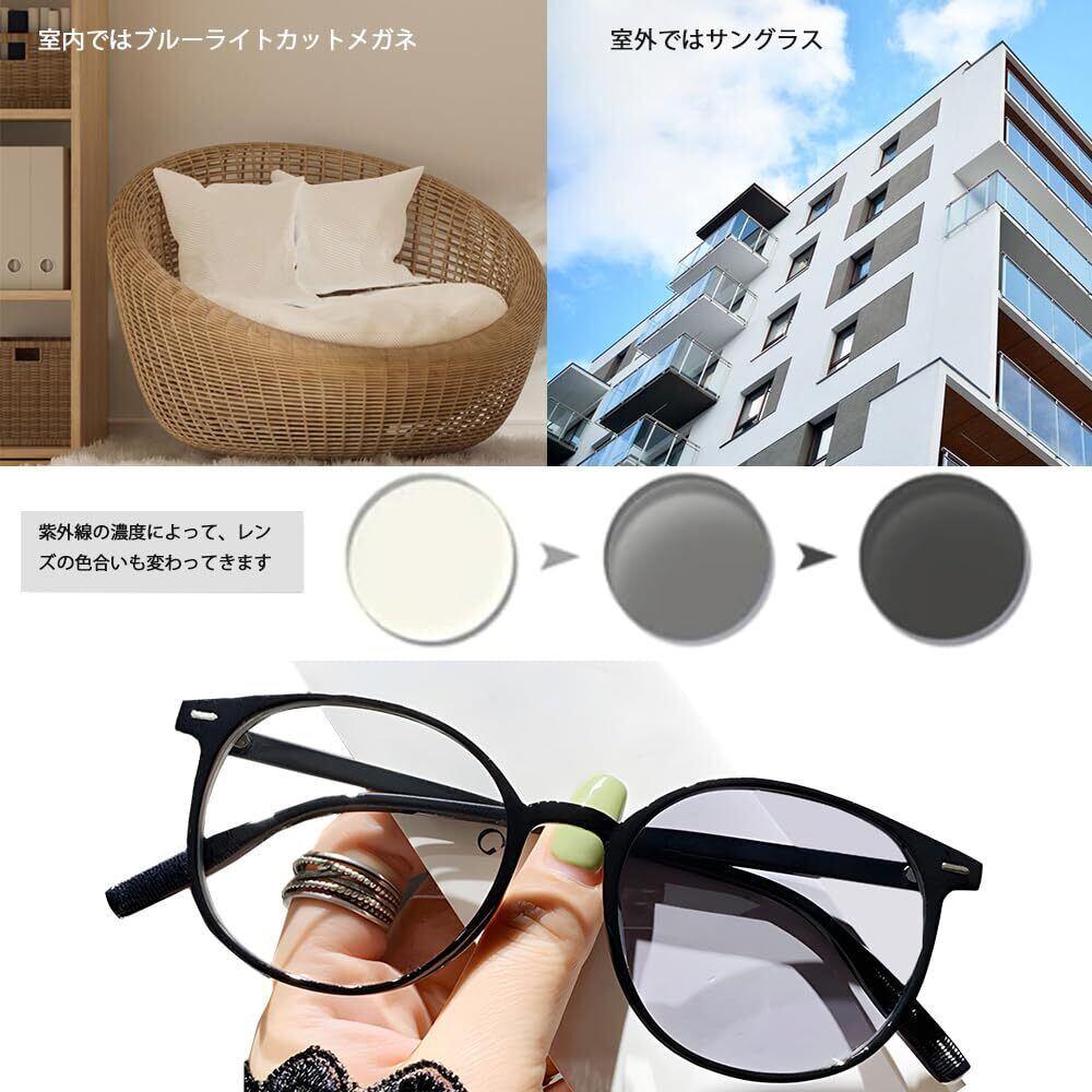 変色調光機能:レンズが紫外線に反応して色が変わり、屋外ではサングラスのように暗くなり、屋内ではクリアになります。曇り、晴れのような天気に気軽に対応することができます