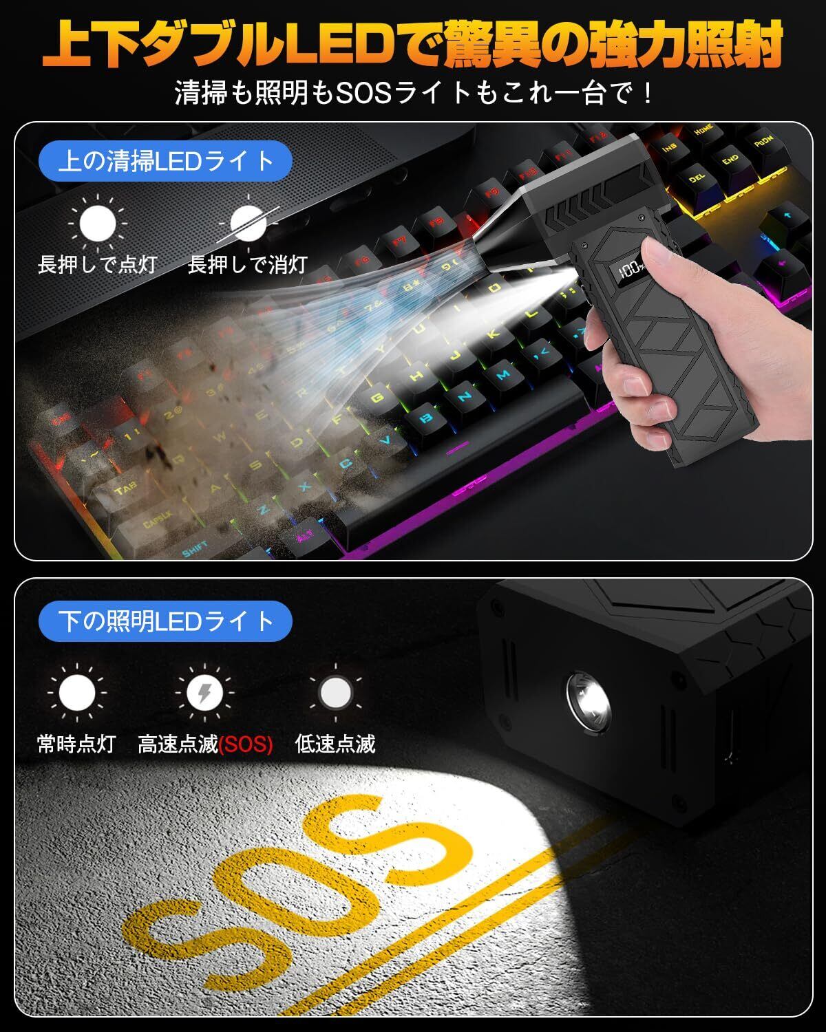 【ダブルLEDで強力照射!清掃も照明もSOSライトもこれ一台】■清掃から照明、手持ちライト・懐中電灯・防災ライトまで、まさに「これ1台で完璧!」の電動エアダスター登場!①上下に搭載したダブルLEDが驚異の明るさを放ち、通常のエアダスターとは一線を画す光量で、暗い隅々も小さな隙間もまるで昼間のように照らし出し、清掃の手間を一気に解消!②さらに、この多機能ライトは、手持ちライト・懐中電灯・防災用・キャンプ用ライトとしても使用可能。停電や緊急時にはもちろん、アウトドアでも大活躍。③その上、LEDの切り替えも超簡単。■上のLEDライトはライトボタンを長押しで点灯・消灯。■下のLEDライトはライトボタンを短押しで常灯・高速点滅(SOS)・低速点滅・消灯。