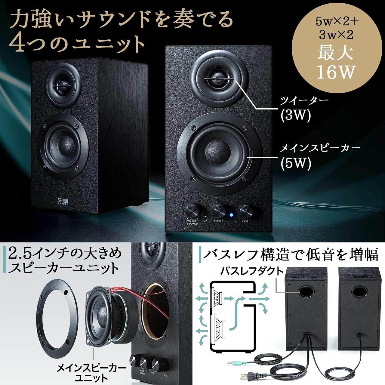 サンワダイレクト PCスピーカー 有線 3.5mm 木製 16W アンプ内蔵スピーカー ブックシェルフ型 400-SP068