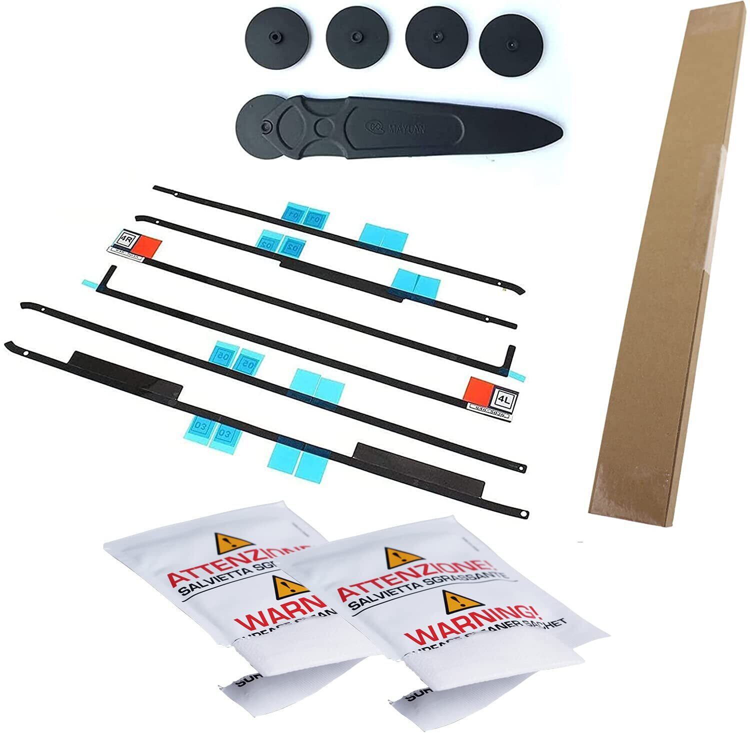 製品内容:両面テープ6本(1台分)、ディスプレイ分解用ツール(1セット)、IPAクリーナーワイプ(2個入)