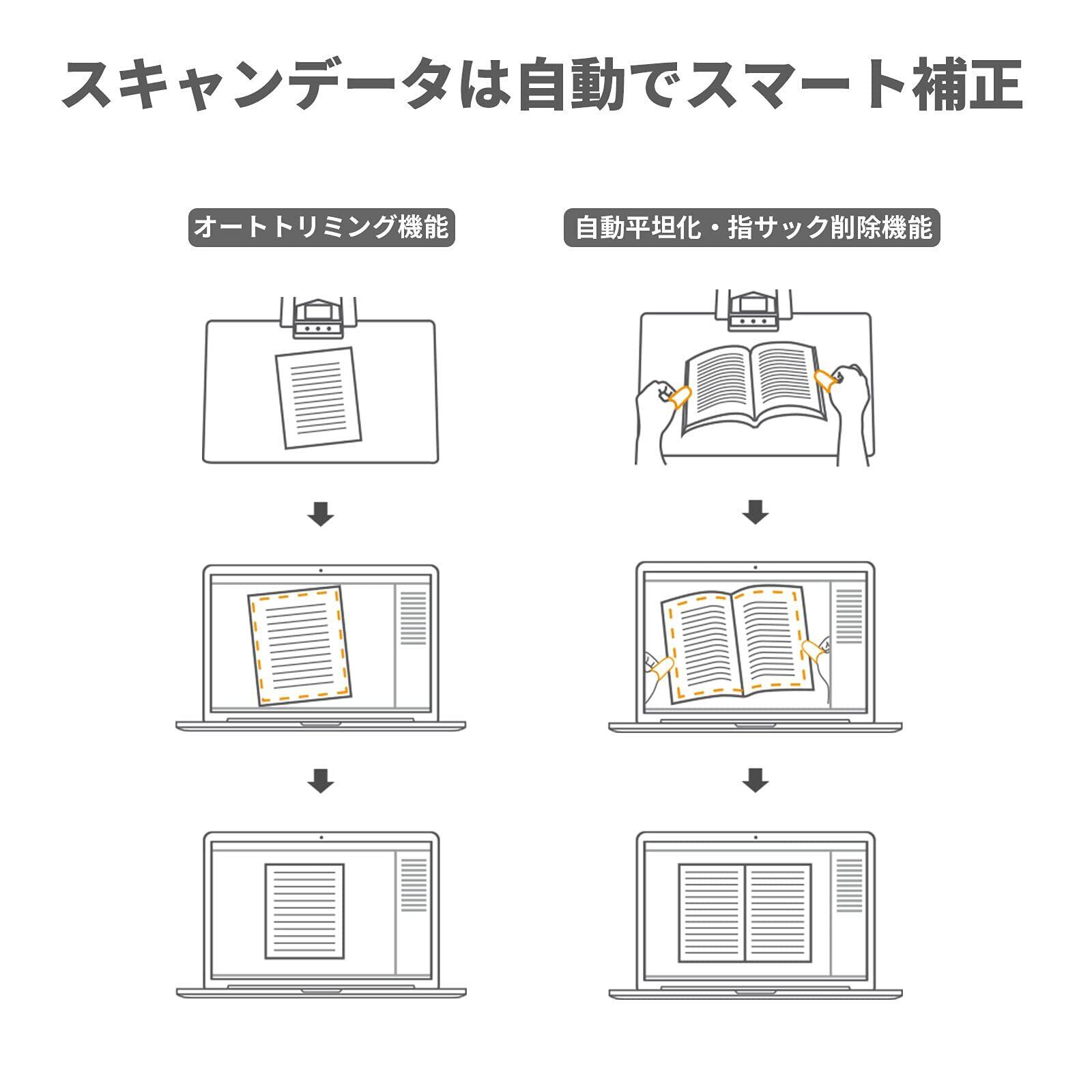 【裁断不要でキレイな電子書籍に】スキャン方法は、専用マットの上に見開いた本をセットし、ペダルを踏むだけ。AIが、本を見開いた時に生じる曲がりを検知し、平らなデータに自動で補正します。注意事項: ①カラー雑誌や写真等の光沢のある紙をスキャンすると、光が反射することで反射した箇所の画像が白くなり見えない現象が起こります。そのような場合、下記をお試しください。 直射日光が当たる場所での使用を控える、または十分明るい部屋で CZUR のライトを消すなど、光の具合を調整する。 部屋中の照明の当てる角度はドキュメントなどに対しおよそ45度の向きが映りこみも少なくオススメです。 サイドライトがあるCZUR ETシリーズ、Auraシリーズの方がまだ反射に強いので、写真やカラー図鑑などメインに考えている方はそちらにオススメです。 ②OCR文字認識について、複数の言語が使用されている場合には、言語設定画面で、使用されている言語をすべて選択してください。操作の詳細はユーザーマニュアルをご参照ください。 ③湾曲補正についてユーザーマニュアルP.13に掲載していますので、こちらの内容をご参考ください。
