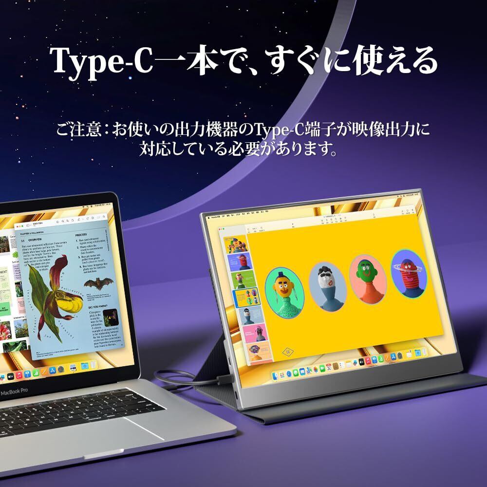 【ご注意・アフターサービス】①USB Type-C to Type-Cで接続する際は、出力デバイスのType-CポートがThunderbolt 3.0以降またはDisplayPort Alt Mode対応である必要があります。購入前にインターフェースをご確認いただき、対応していることを確認すれば、スムーズに接続できます。 ②接続端末から電源を取る場合、端末の電力が不足する可能性があります。この場合は、別途電源を供給してください。 ③最大解像度2256×1504ですが、実際に利用できる解像度は接続デバイスの出力能力によって異なります。接続方法によっては、出力可能な解像度が異なるデバイスもあります。 ④ご使用中にご不明な点がございましたら、いつでもご連絡ください。