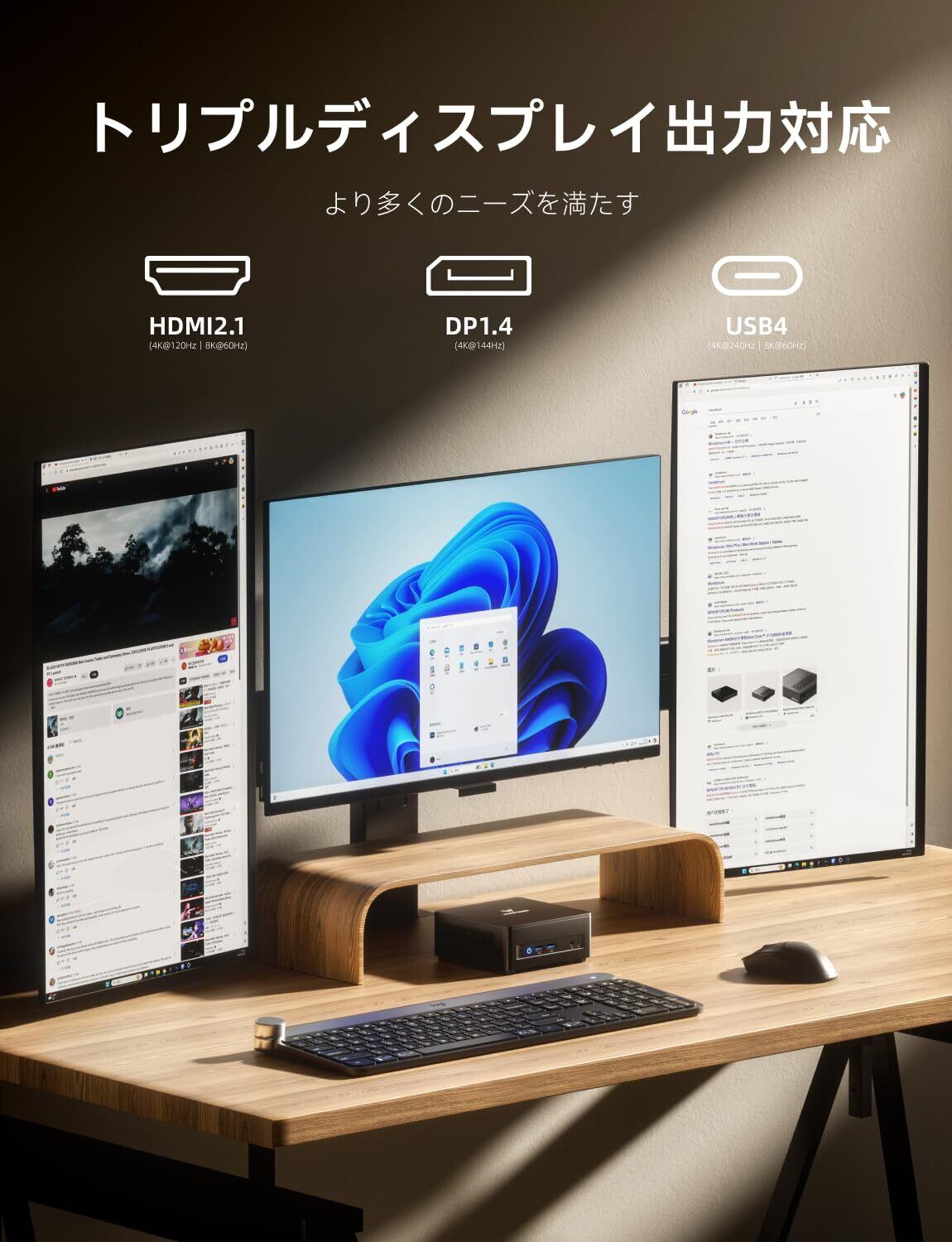 【トリプルディスプレイ出力】ディスプレイ出力端子にHDMI 2.1(4K@120hz/8K@60Hz)x1、DP1.4(4K@144hz)x1、USB4(4K@120hz/8K@60Hz)X1を搭載しており、同時に3台のディスプレイへ独立出力できます。より大きく広い視野を提供し、仕事の効率を向上させ、オフイスでの作業、エンタ-テイメントメデイアの再生、ゲーミングを同時に使用して様々なニーズを満たす。【USB4】USB4ポート搭載。最大は40Gbpsに達します。15W PD給電対応、ケーブル一本で、映像と電源を送る事が出来できます。