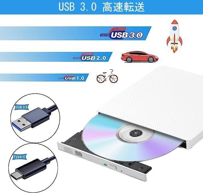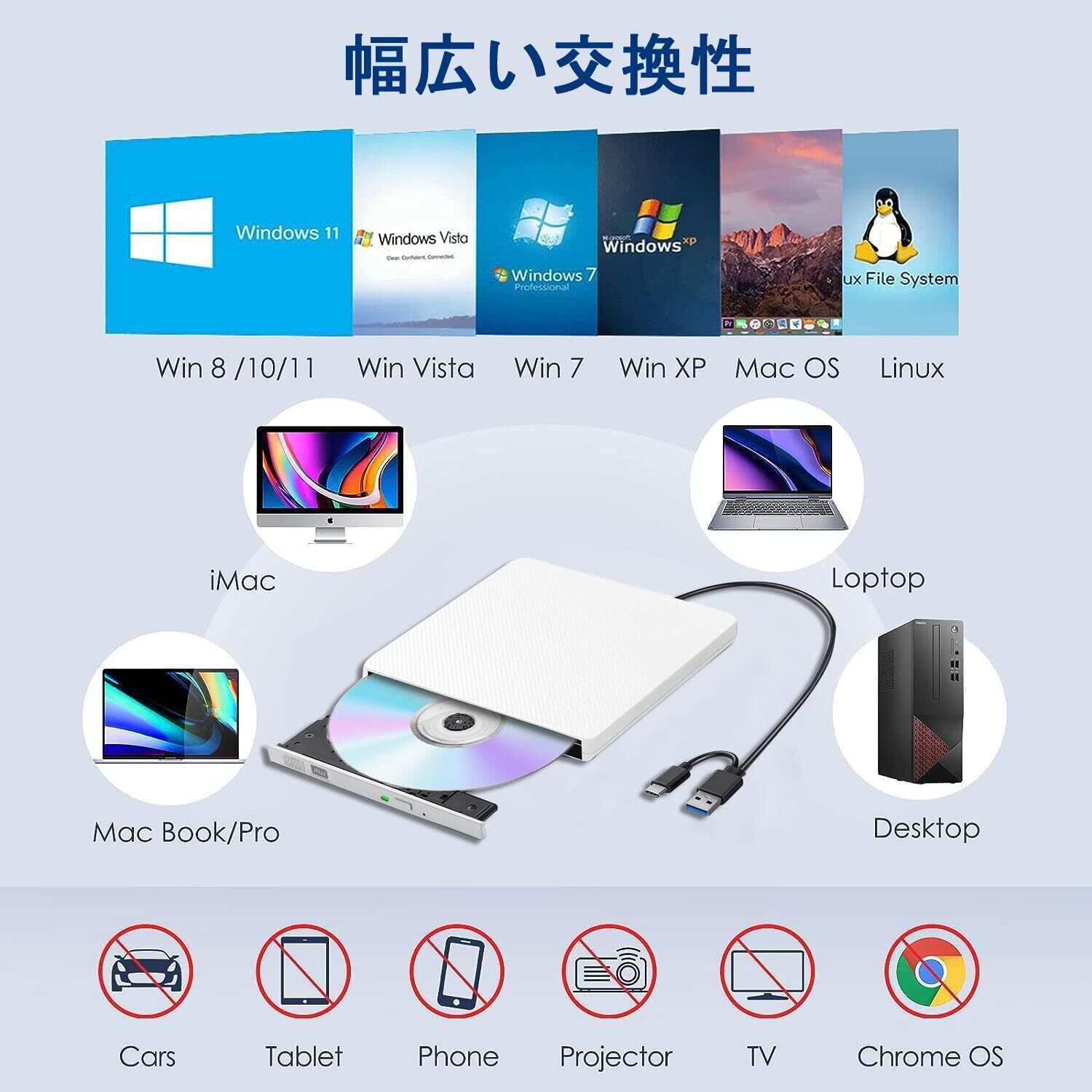 外付CD・DVDドライブ DVDレコ CD/DVD-Rプレイヤー USB3.0&Type-C両用ケーブル Window/Linux/Mac OS対応 読み出し&書き込み エラー校正 TYPE-Cコネクター付き 景品DVD-R付き 日本語取扱説明書付き (ホワイト)