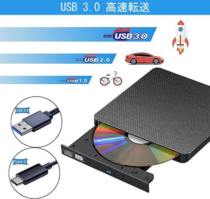 外付CD・DVDドライブ USB3.0/Type Cポート付き CD/DVD読込み 録画込み対応 CD/DVDプレーヤー 外付け光学ドライブ PC外付け ポータブル CD/DVDドライブ ノートパソコン CD/DVD読取・書込 DVD±RW CD-RW USB3.0/2.0 Window/Linux/Mac OS対応 高速 静音 超スリム 薄型 コンパクト (Black)