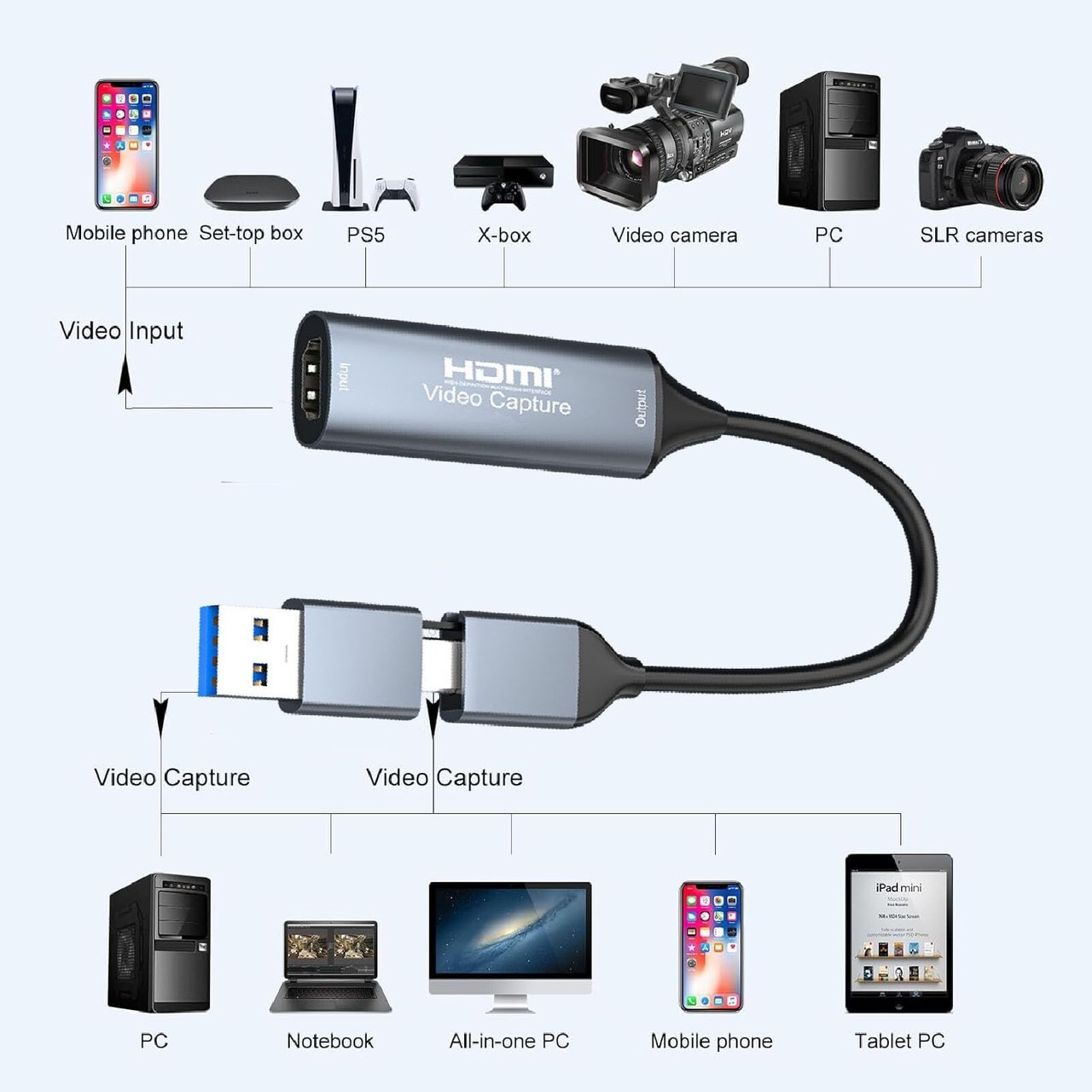 【TYPE-C/USB 2 in 1 HDMIキャプチャーボード】hdmi キャプチャーボード はtype-cとUSB 2.0の2つの出力端子から構成され、多種の設備の使用ニーズを満たし、すべてのUVCとUACプロトコルに対応する第三者プレーヤーソフトウェアをサポートし。対応PS 4 Pro、XBox One、Switch、Wii U、カメラ、ビデオカメラ、携帯電話、ノートパソコン、パソコンなどの機器。