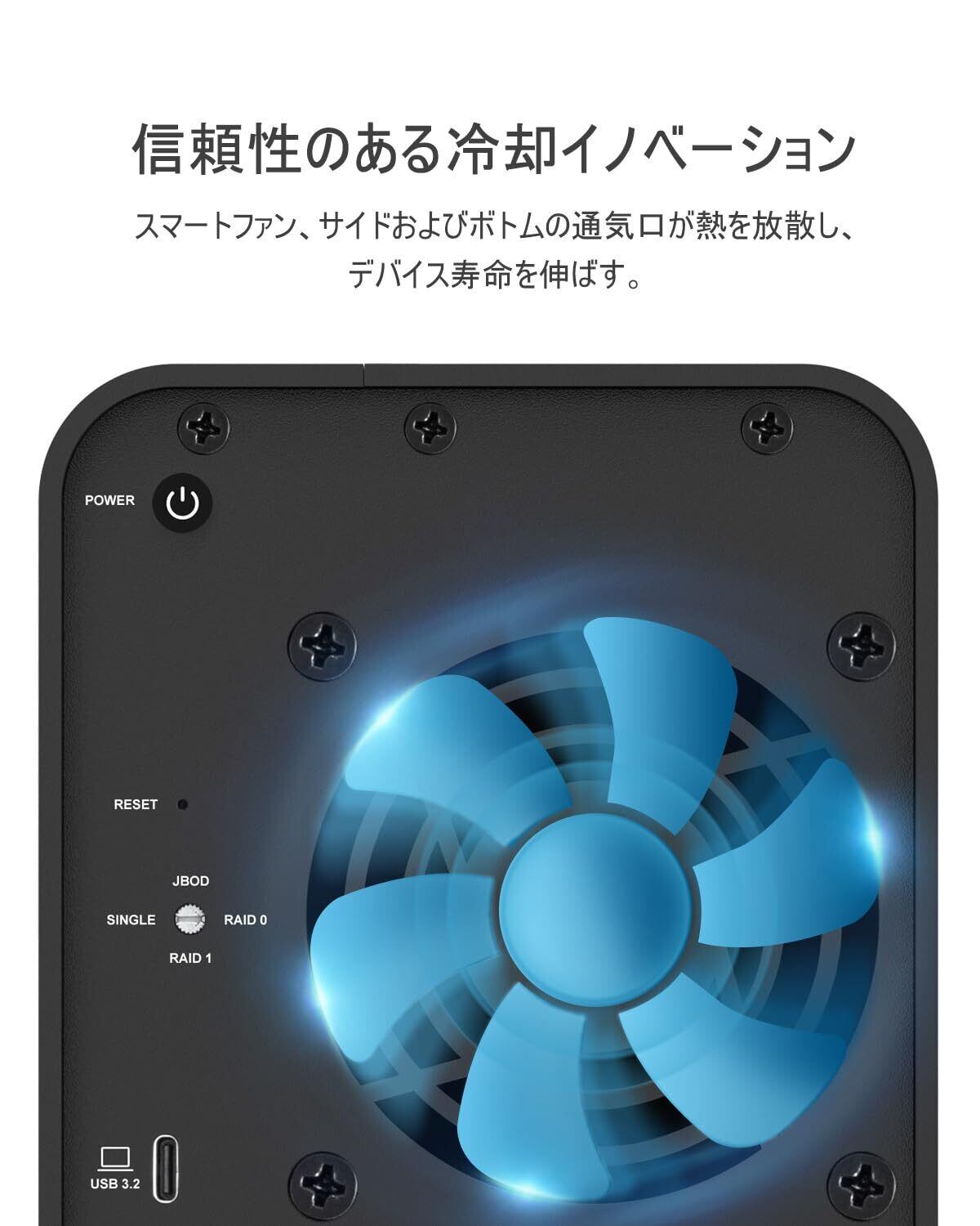 高速接続:F2-424 NASケースは、2.5 GbEのデュアルインターフェースを備え、リニアデータ転送速度は283 MB/s(NAS専用HDD 18TB x 2、RAID 0で試験済み)に達します。リンクアグリゲーションによるネットワーク帯域幅は最大5 Gbで、複数ユーザーのアクセスや複数ファイルへの並行アクセスに最適。USB 3.2 Gen2 10Gbpsのデュアルインターフェースにより、NASと外付けデバイス間のデータ転送も高速です。F2-424は、 RAID 0/1/JBOD/Single 、TRAIDなどさまざまなRAIDタイプに対応します。