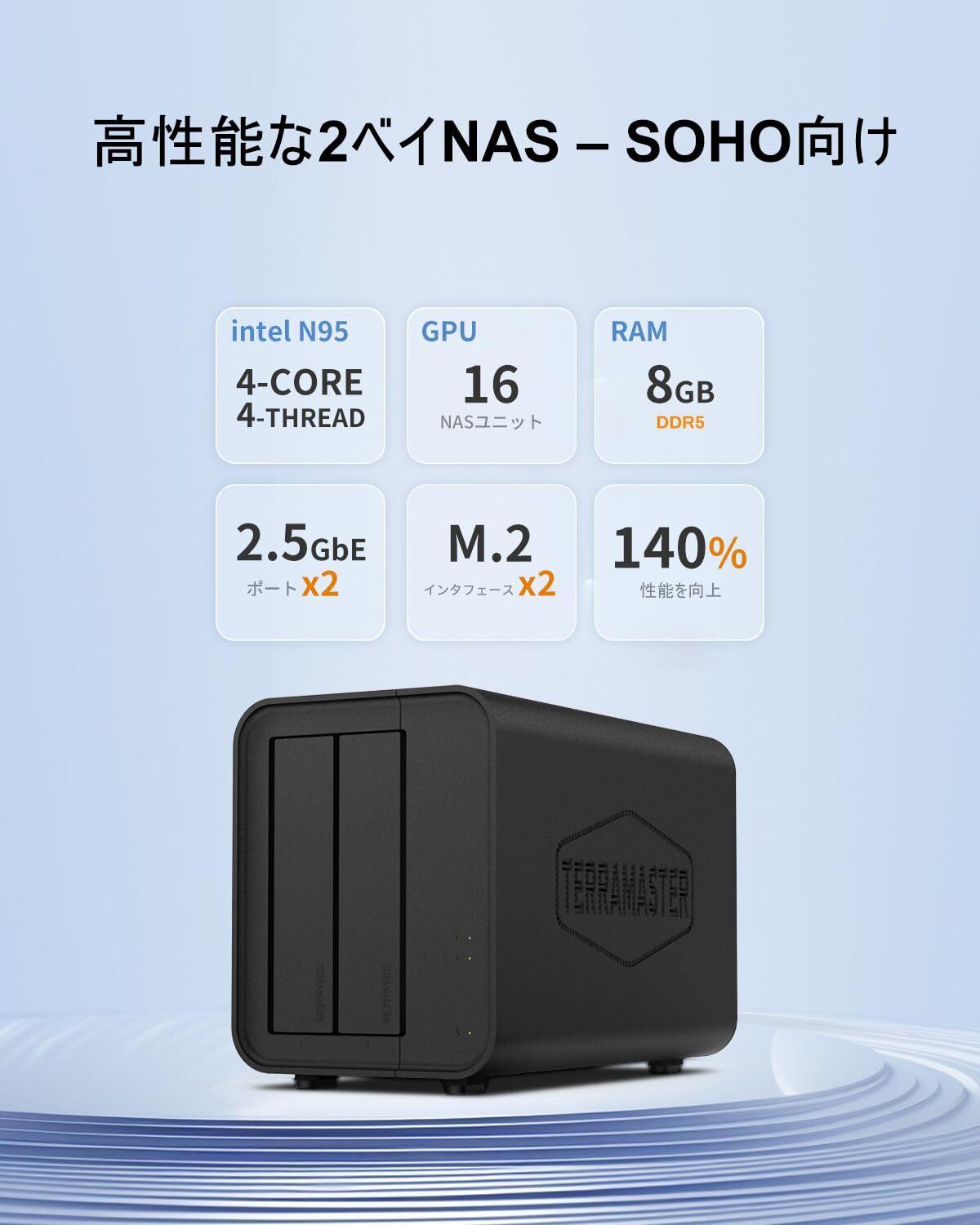 【特価セール】TERRAMASTER テラマスターF2-424 NASストレージ – 2ベイ N95クアッドコアCPU、8GBのDDR5 RAM、2.5GbEのLAN x 2、高性能ネットワークアタッチドストレージ「HDD付属なし」