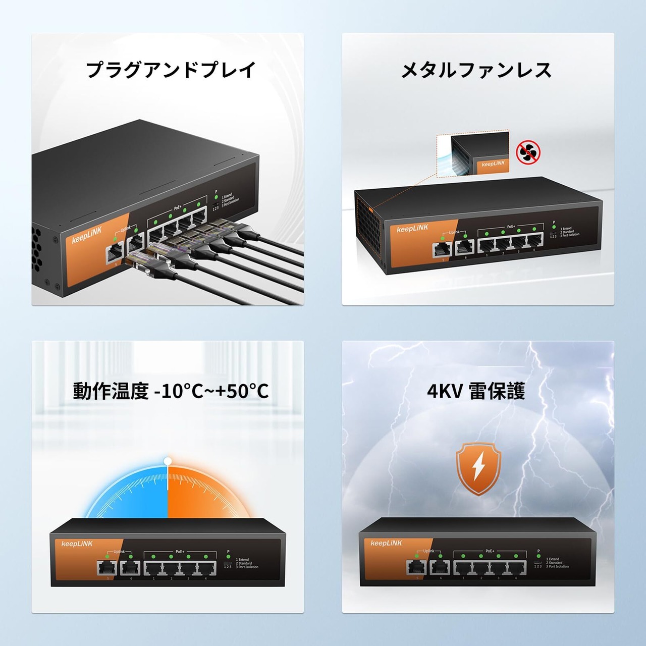 keepLiNK 6ポート PoE スイッチングハブ 10/100Mbps (4ポートPoE+ 65W) 静音ファンレス 金属筐体 省電力設計