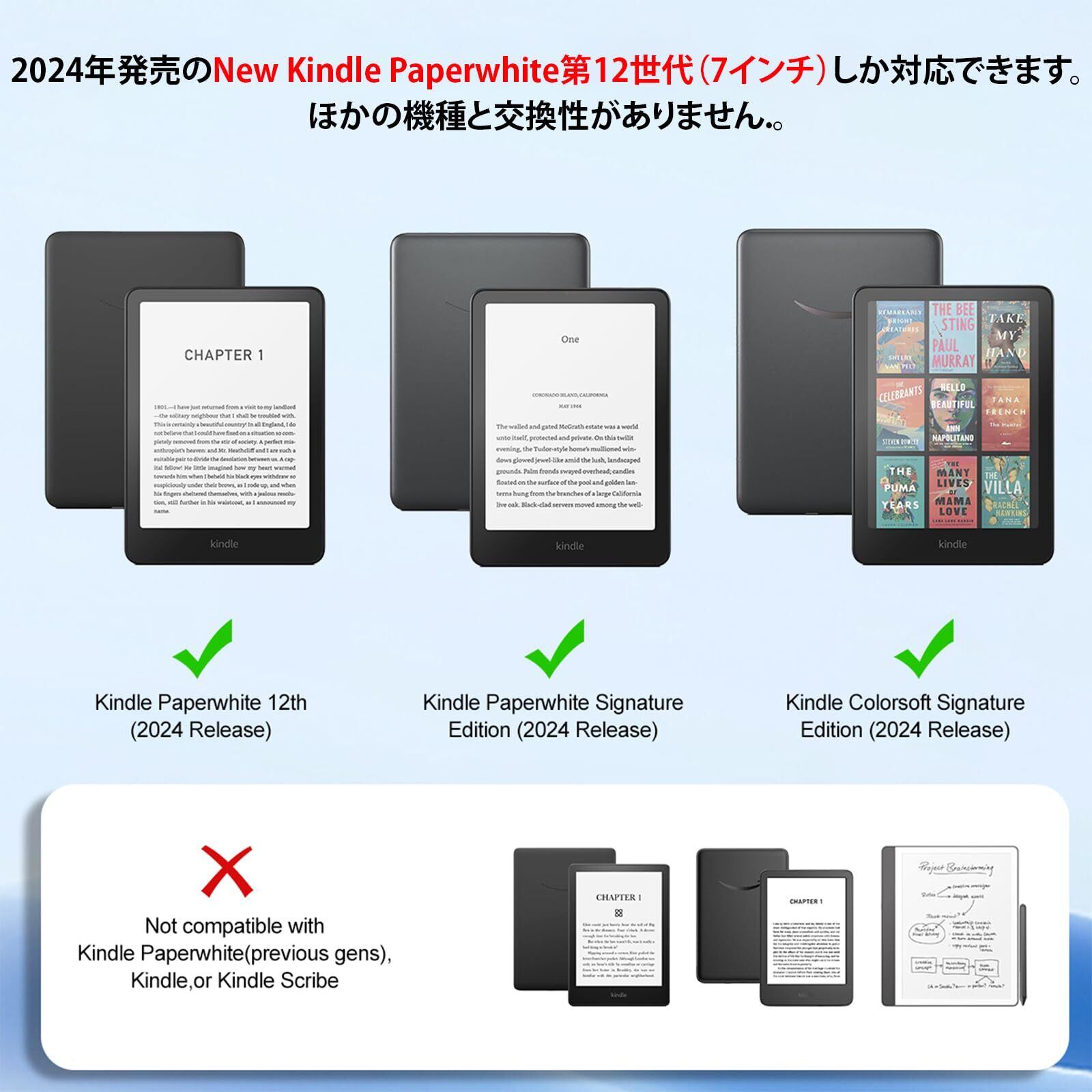 【対応機種】2024年発売のNew Kindle Paperwhite第12世代(7インチ)しか対応できます。ほかの機種と交換性がありませんので、購入する前に、必ず機種をご確認ください。