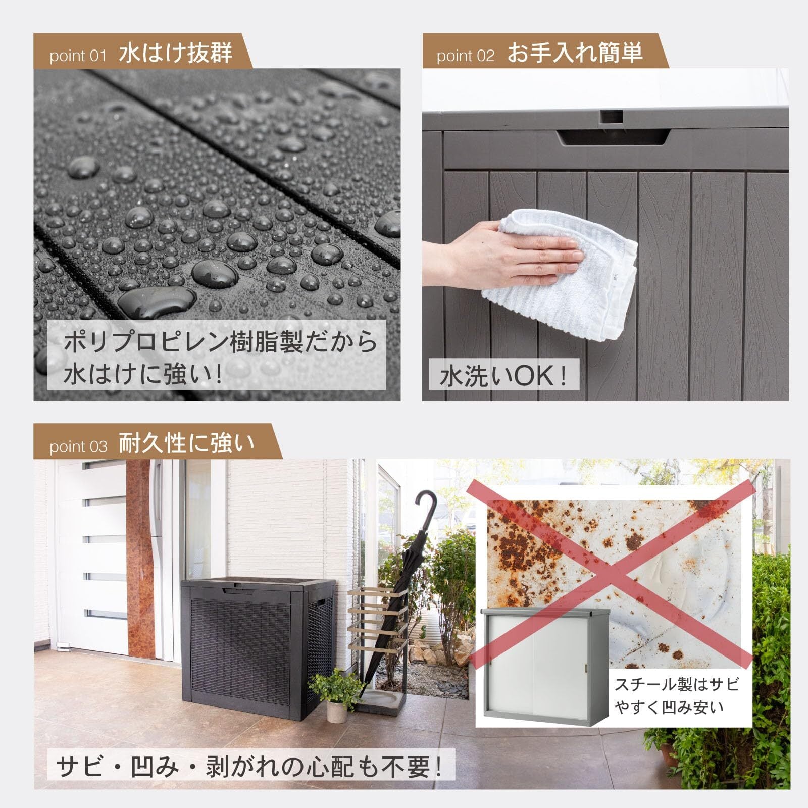 【機能性抜群!使い勝手良し!】PYKES PEAKの収納庫は、ポリプロピレン樹脂素材を採用しているため、水はけ抜群でガーデンやベランダなど屋外に置いても安心です。木製や金属製とは異なり、サビや剥がれの心配も不要です。UV保護と耐候性もあり、紫外線で劣化しにくく、長期間外に置いても色褪せません。お手入れも簡単で、汚れた際も水洗いOKです!