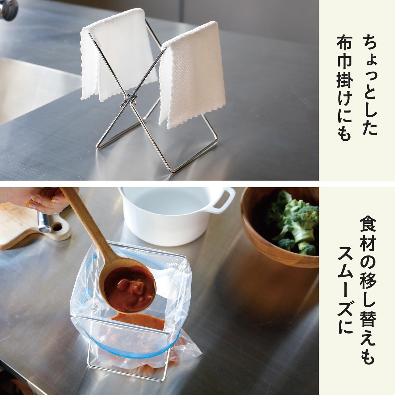 ゴミ箱として使わないときは、ちょっと布巾を掛けておくことも出来ます。しっかり自立するので、食材を鍋から移し替えるときも、食品の保存用袋などを掛けてお使いいただけます。
