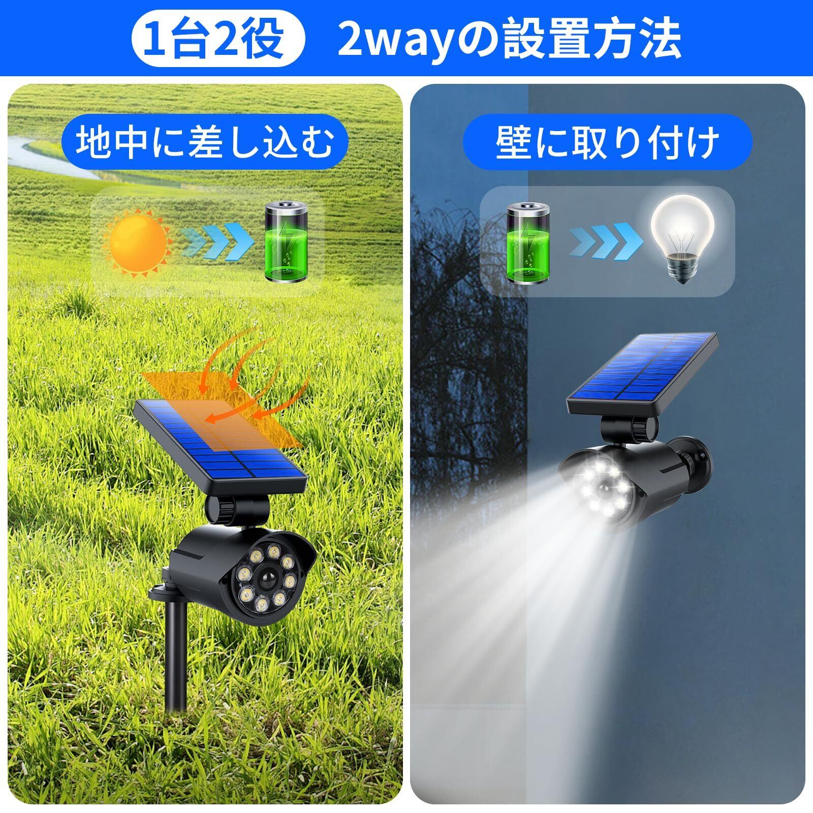 【2WAY装置・1800mAh大容量バッテリー】センサーライト 屋外には設置できる2タイプで、センサーライトの壁掛けだけ仕様から進化し、ソーラーライトと接続パイプを分離して設置することで、地面差し込んで可能になるガーデンライトです。壁に固定でも自由にご利用できます。壁にも取付簡単ですから、女性とお年寄りも気軽に使えます。