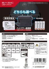 手元作業に最適なフラッド照射タイプ専用充電池または単三形乾電池どちらも選べるハイブリッド式最大500lm、250lm、50lm 選べる3照射切替フリッカー対策済・電池残量警告付連続使用時間 :モード1 50lm:21h、モード2 250lm:12h、モード3 500lm:8h
