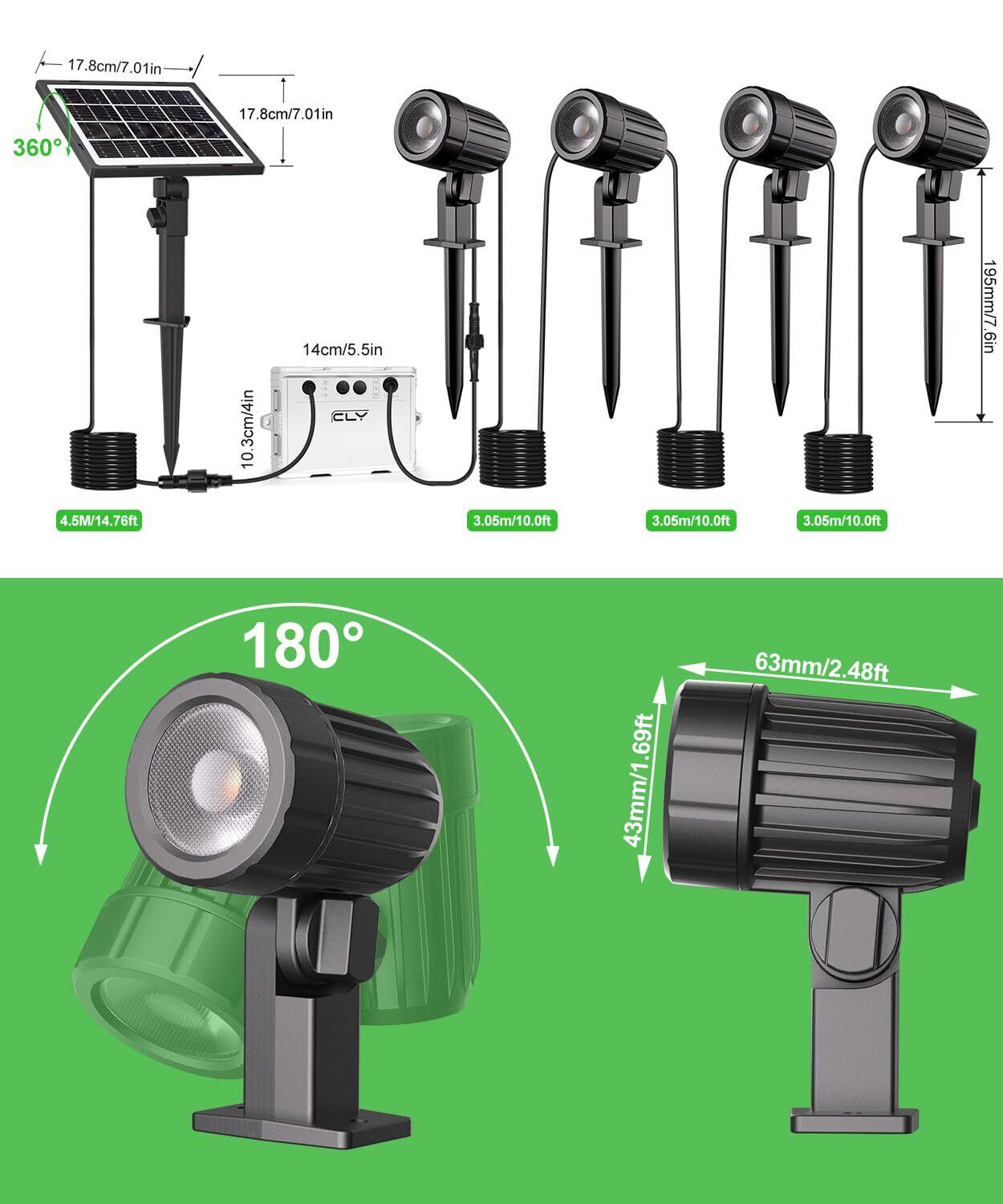 CLY ソーラーライト 屋外 ガーデンライト ソーラー LED スポットライト 分離式 明るい3色切替・2段階調光 5000mAh大容量 IP66防水 電球色/昼白色/昼光色 4灯セット パスライト 高輝度 集光レンズ 14mコード 明暗センサー 自動点灯/消灯 アウトドア 庭 タカショー 玄関 芝生 駐車場 家の前 歩道 植栽 デッキ テラス屋根 ガーデニング 防犯対策