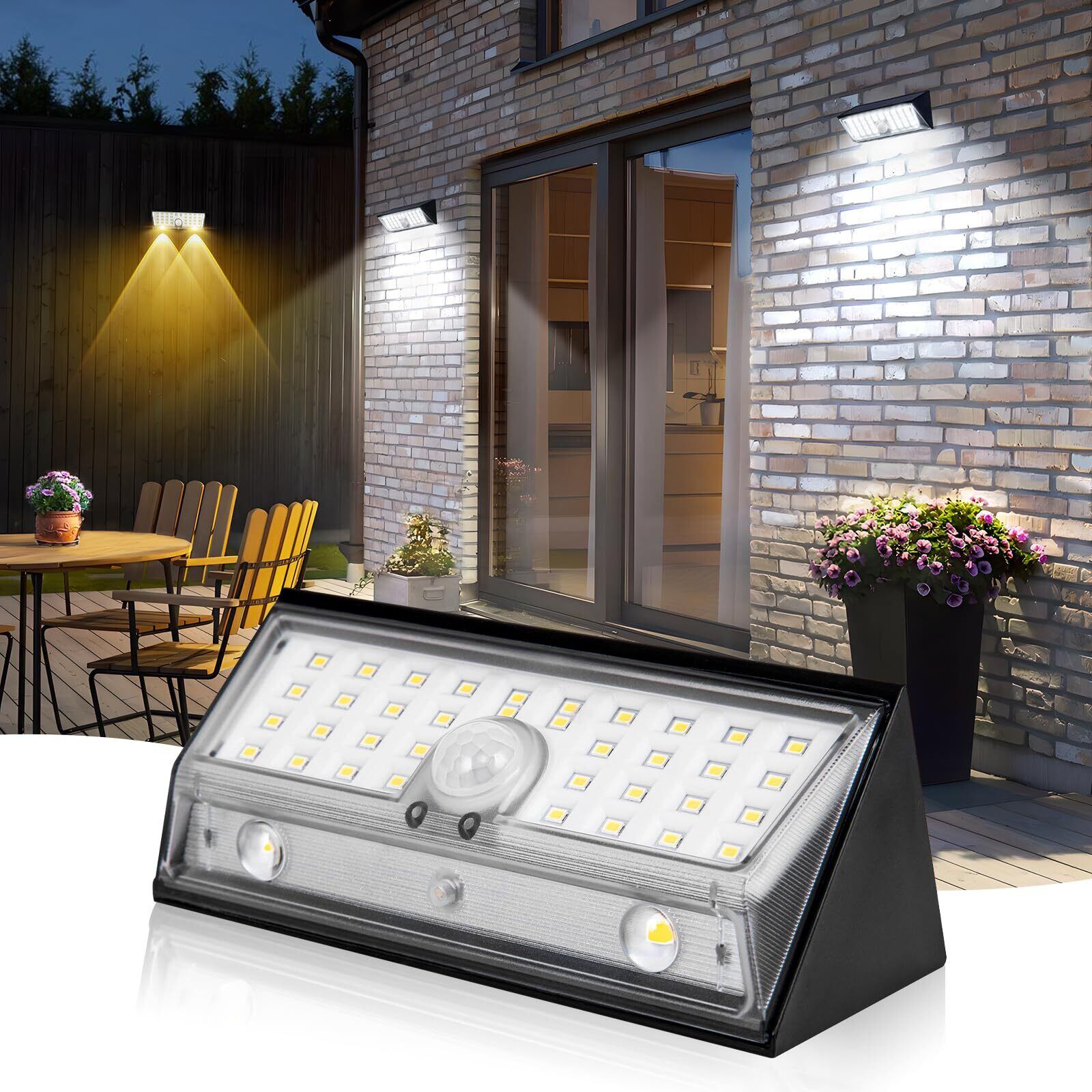 【広角センサー&高輝度LED】:高感度PIRモーションセンサー+光センサー内蔵でセンサーライトとして優れた反応性能を発揮。約5m以内の動きを素早く感知。38個の高輝度LEDを搭載し、約42㎡の広範囲をしっかり照らします。夜間の駐車場や通路の照明にも最適です。