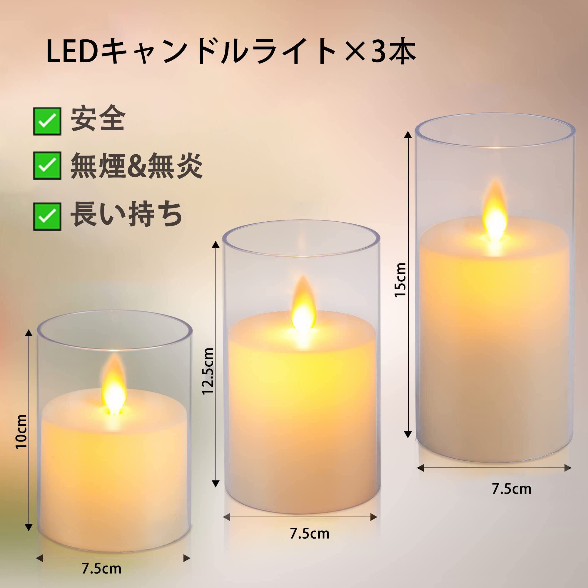 【セット内容】: LEDキャンドル×3本 サイズ:L(直径7.5cm×高さ15cm)、M (直径7.5cm×高さ12.5cm)、S(直径7.5cm×高さ10cm)単3電池(別売り)、リモコン*1、リモコン用電池:ボタン電池1個(付属)、取扱い説明書*1 【注意事項】LEDランプの寿命は50,000時間以上です。次のようなヒントにもっと注意を払う限り、それは再利用可能です。 ※直射日光を避け、熱源から遠ざけ、極端な温度にしないでください。※防水性がないため、水のかかる恐れがある場所では、ご利用にならないでください。