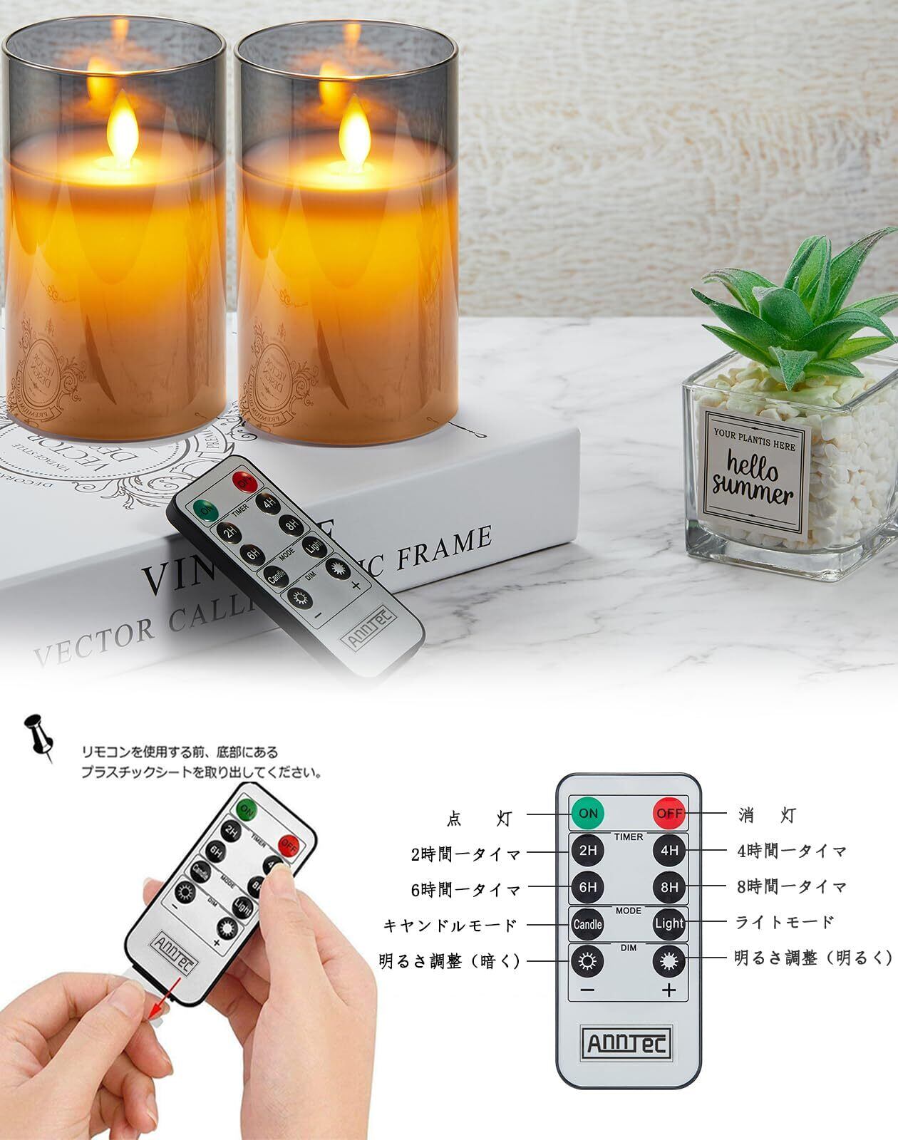 【2点セット】AnnTec LEDキャンドルライト ロウソク 本物の炎のようにゆらめく 暖色光 火を使わない ゆらゆら揺れる 安全 省エネ 専用リモコン付き 明るさ調整 LEDキャンドル LEDロウソク 電池式 ガラス (直径7.5cm×高さ15cm) (グレー)