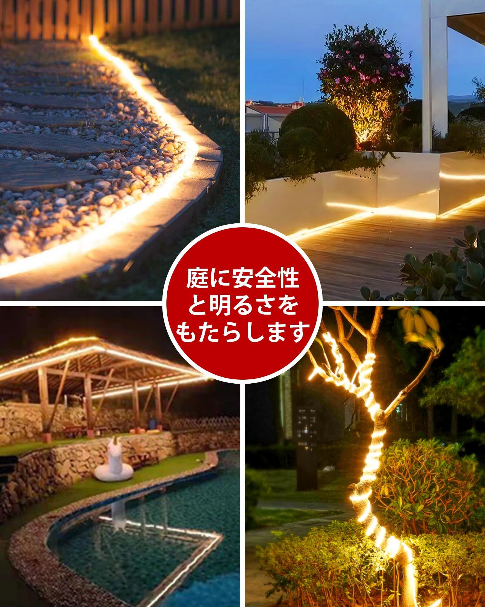 アップグレードされたソーラー テープライト:このLEDテープライト5mは高輝度の300枚LEDを配置されたため、輝度はほかのledテープライトより明るくなります;屋外テープライトは幅10mm、厚さ5mmで、柔軟性が向上して折れにくいですので、長くご利用いただけます。注意してください: これらのライトは屋外の装飾に最適な柔らかな周囲光を提供しますが、広いエリアの高輝度照明に代わるものではありません。
