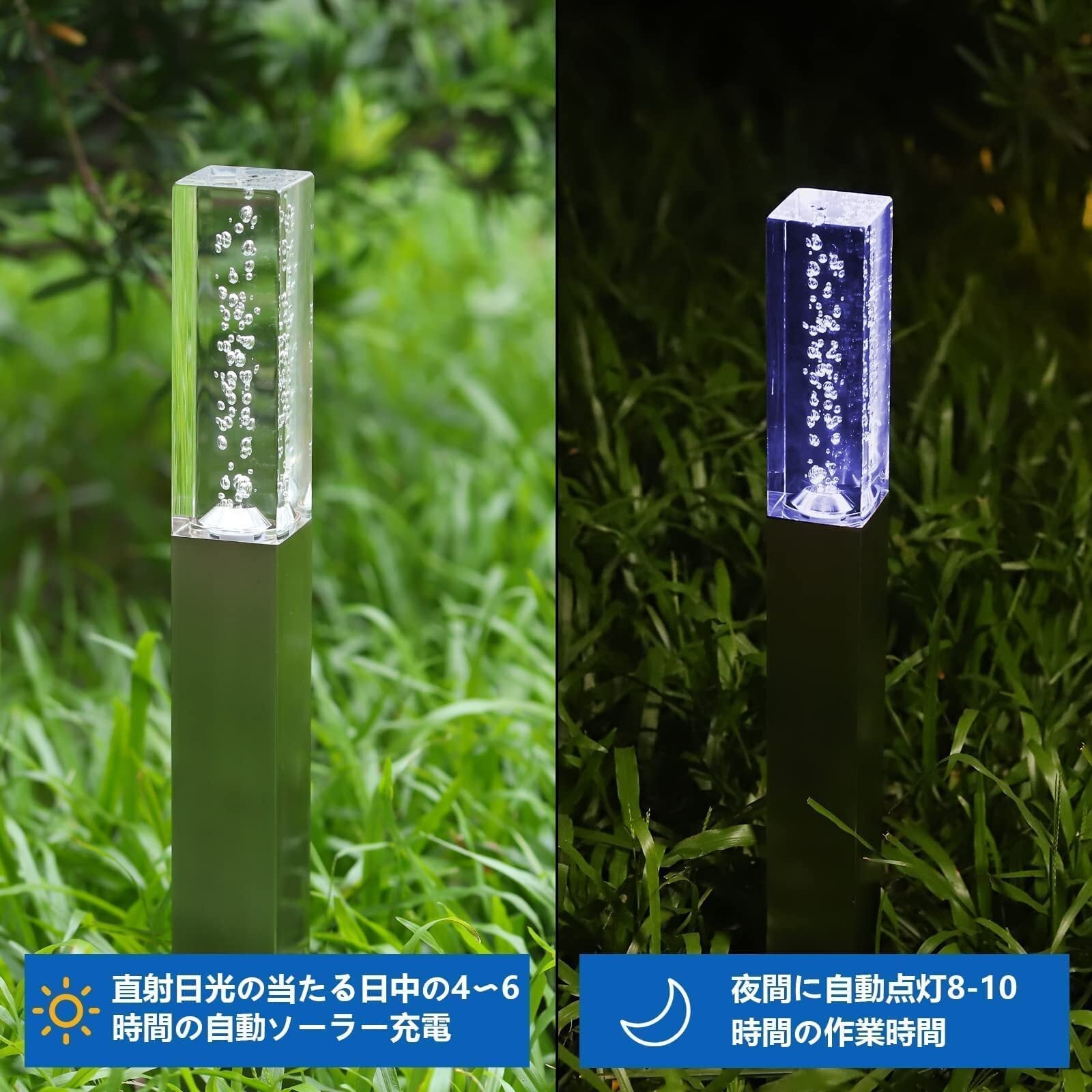 【仕様】高品質ソーラーパネル使用、防水規格:IP65、6cm角ポール、高さ 50cm、自動点灯・自動消灯、ソーラー専用充電池内蔵。