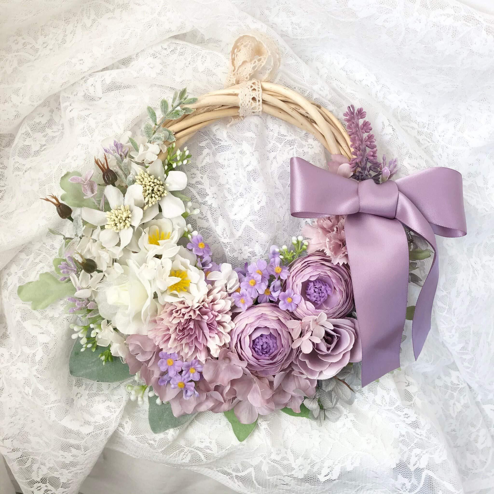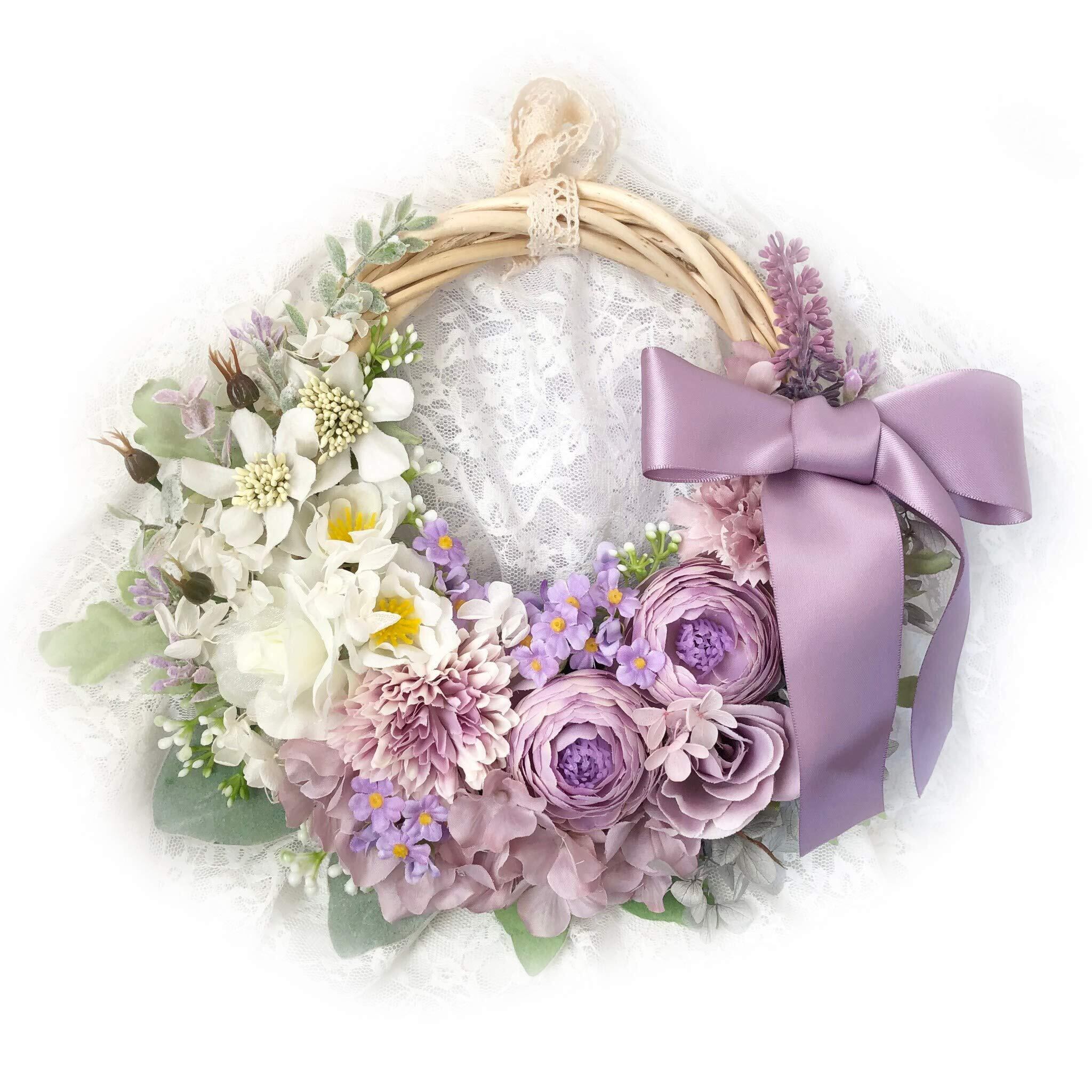 淡いラベンダー色のお花や大きめのリボンで上品でナチュラルな雰囲気のリースに仕上げました。 春の訪れのほわーっとした気分にもマッチするかと思います。 リースを眺めて穏やかな気分に浸っていただければと願います。