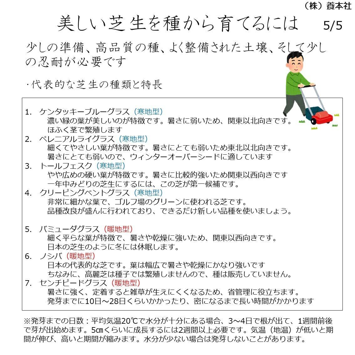 内容量:400g(約10㎡~20㎡分)まきどき:春3月下旬~6月・秋8月下旬~10月 発芽率:75%以上