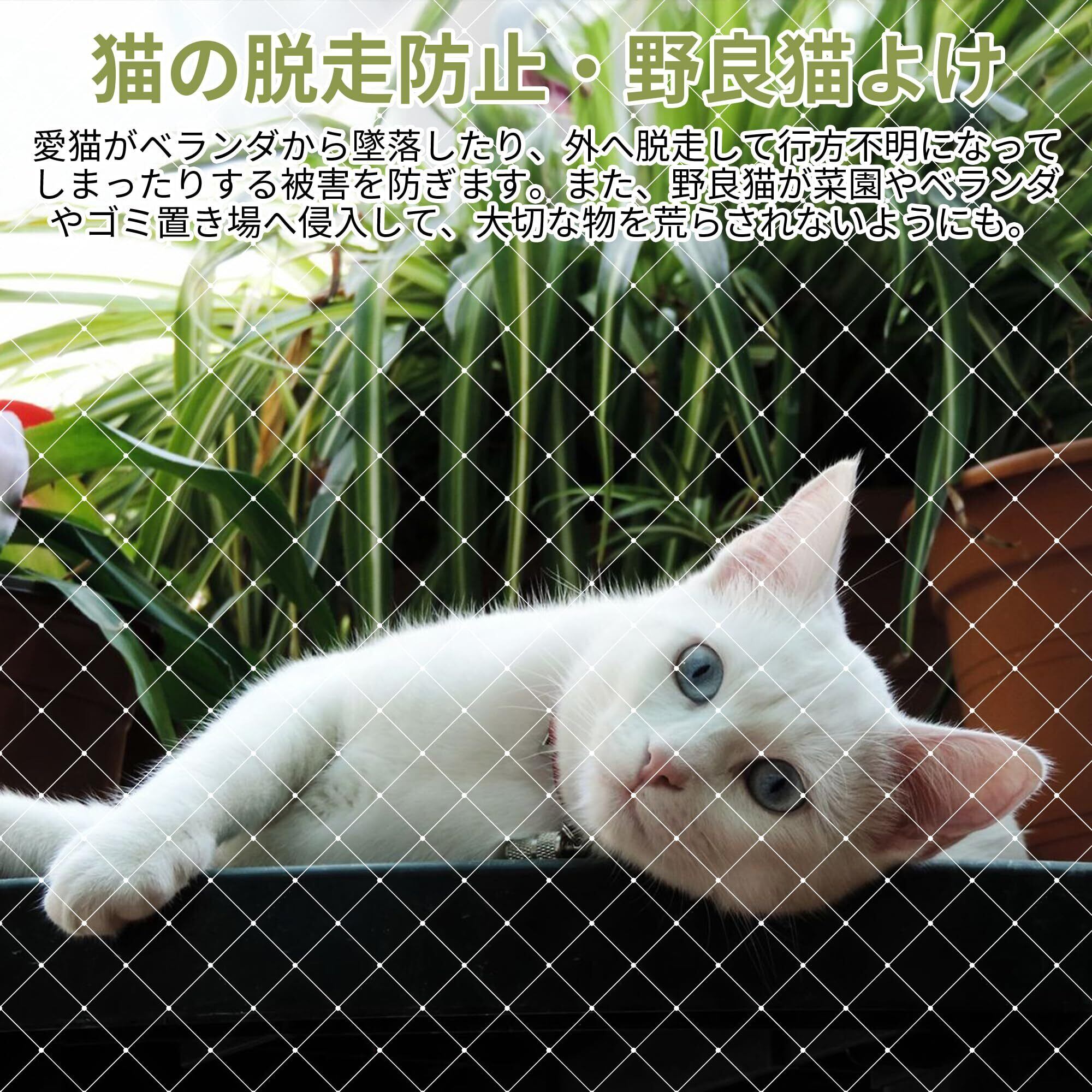 【猫の脱走防止や野良猫よけ】鳥避け ベランダは鳥よけや鳩避けの用途を除いて、可愛らしい愛猫の脱走防止用、またはのら猫の侵入防止用にもご利用いただけます。特に好奇心も持つ子猫に対しては、ベランダからの墜落や、外へ脱走して行方不明になってしまうことなどの被害を防ぎに役立ちます。また、野良猫の侵入を防ぐことで、菜園やベランダやゴミ置き場へ入り、大切な物を荒らされないようにする猫よけネットです。