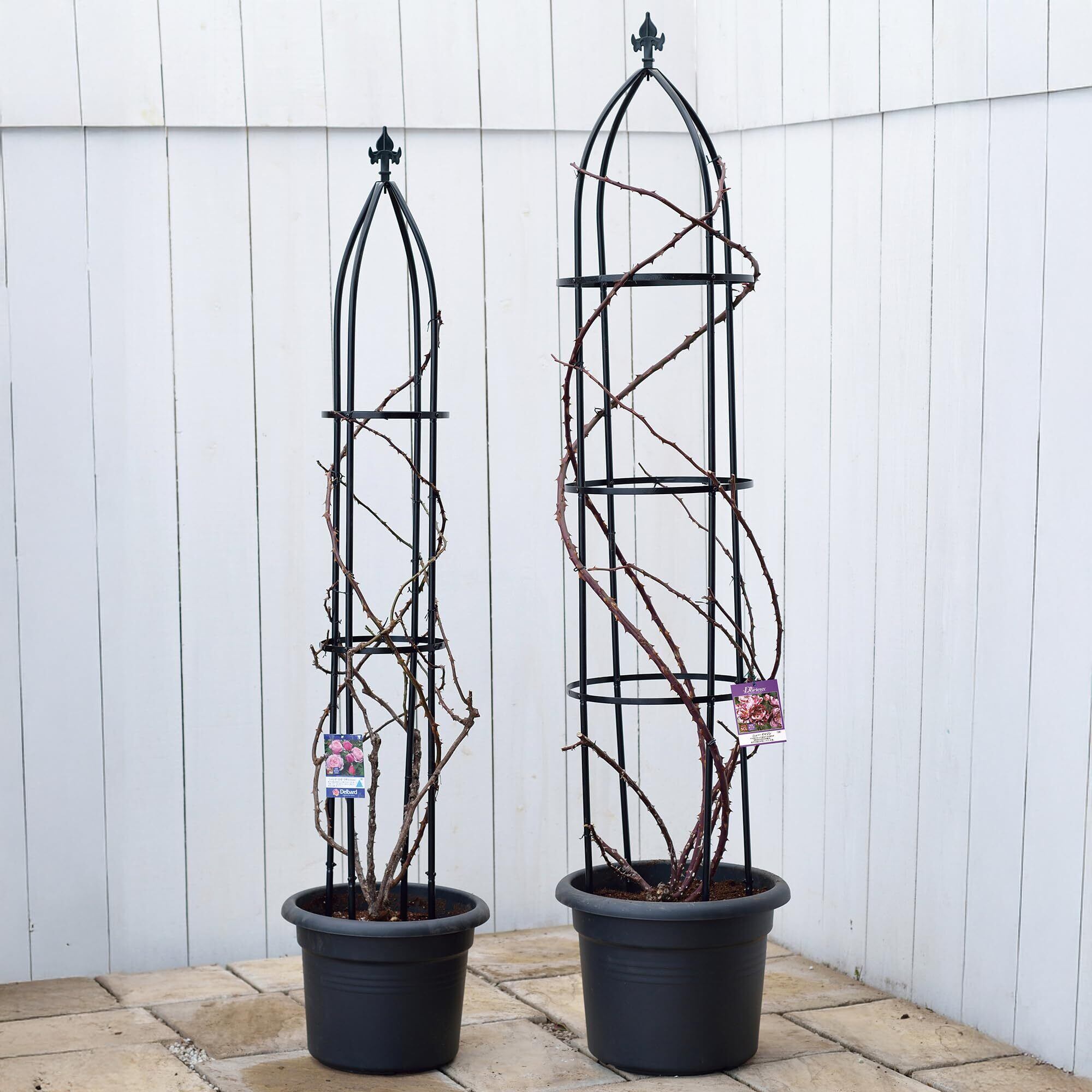 バラやクレマチスなどのつる性植物との愛称に優れたオベリスクです。