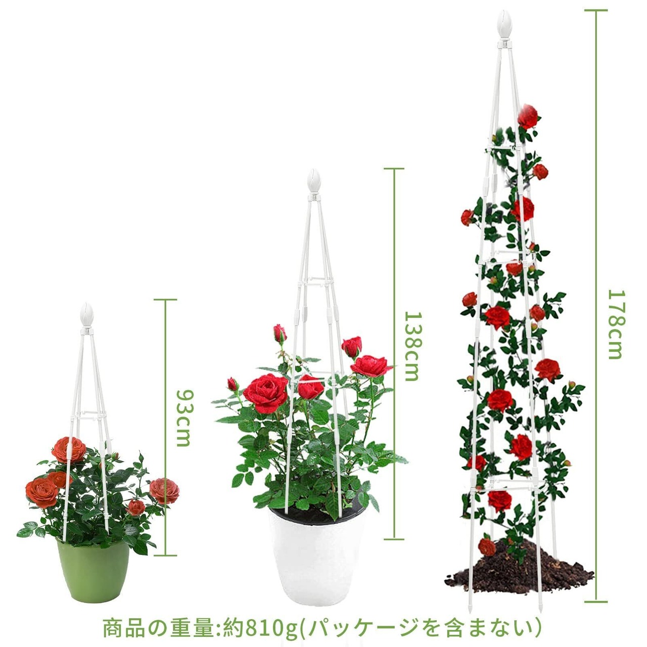 【植物の成長をサポート】このミニオベリスクは、オベリスクの高さは自由に調整することができ、93㎝、138㎝、178㎝、三つの段階で調整することが可能です。つる性植物やつる植物を支えるための優れた構造です。植物がオベリスクに巻き付くことで、より直立した状態で成長し、美しい形を保つことができます。垂直方向に成長する植物をサポートするため、庭やベランダなどの空間を有効に活用することができます。特に、狭いスペースでの園芸に適しています。