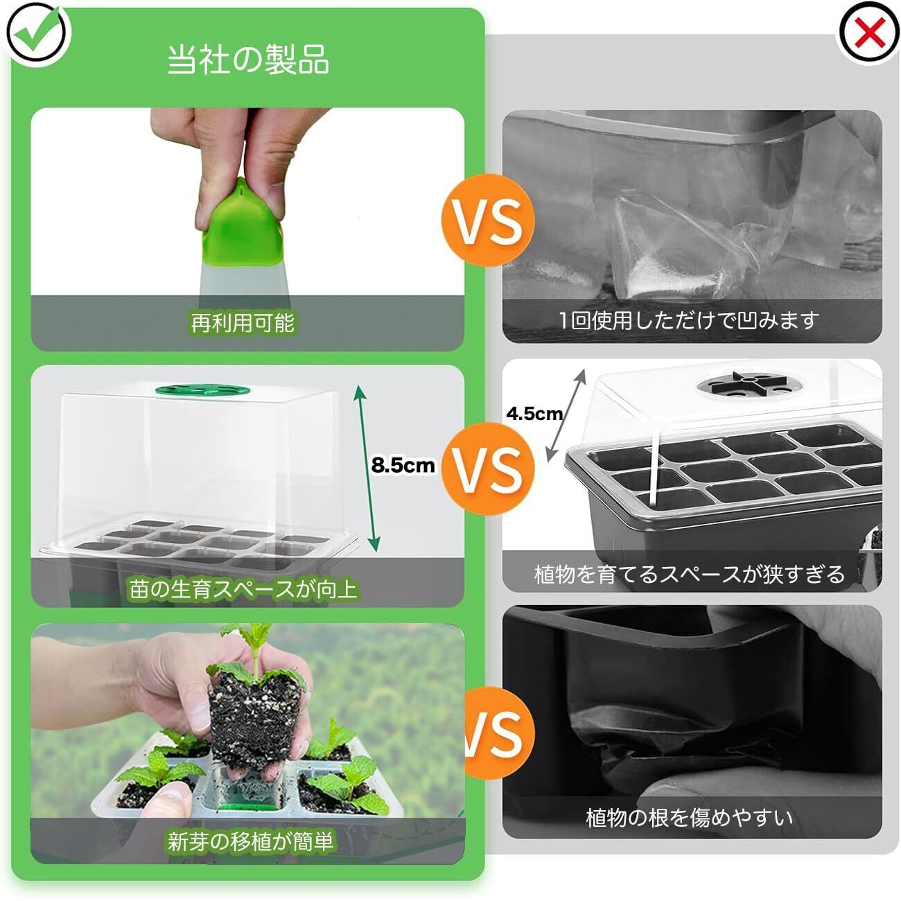 しっかりとした素材と優れたデザイン当社のシードスタータートレイは高品質のプラスチックで作られており、しっかりしていて耐久性があります。 各湿度ドームには調整可能な通気口があり、レギュレーターを回転させることで内部の湿度と温度を簡単に調整できます。