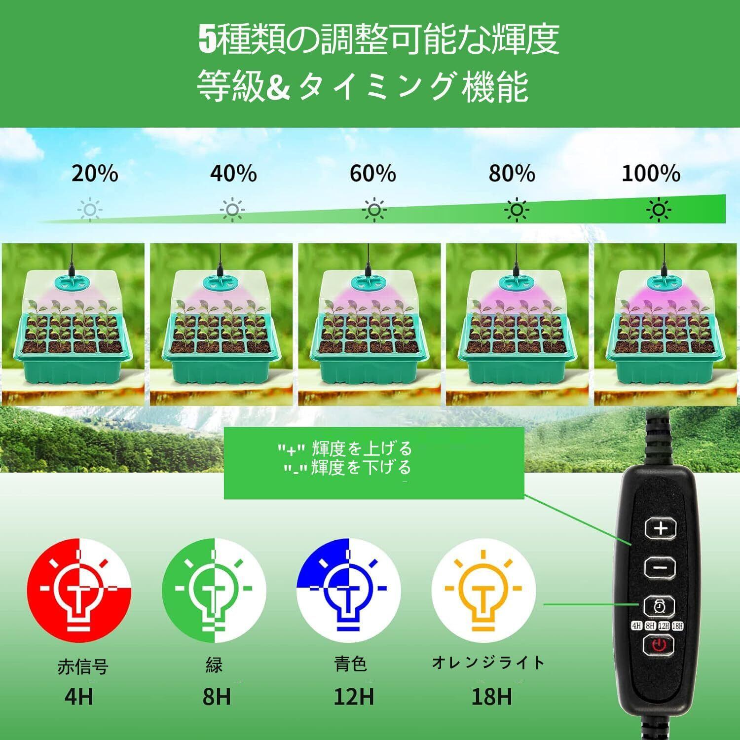【適用範囲広い】植物成長灯付き育苗ポットは種子発芽、幼苗、多肉挿入など多くの植物の絶好の選択。トマト、ジャガイモ、ピーマン、ナス、花、ハーブや野菜などの小さな種子、または果物やその他の植物に非常に適し、家、農場、中庭、バルコニーで利用するのも完璧。初心者に向けて絶品と言っても過言ではない。