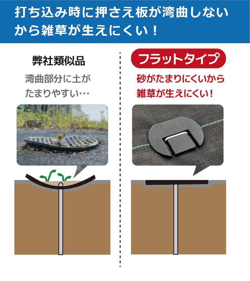 ■【特徴】コの字ピンと押さえ板が一体になった、作業効率のいい押さえピンです!これまで面倒だった、ピンと押さえ板を併せる作業が無くなります!フラットタイプではコの字ピンを採用!Uピンタイプと比べ、凹凸が少なく見た目もすっきり!凹凸部分に土が溜まって、そこから草が生えてくることもなくなります! ■【本体サイズ】(約)長さ:20cm 本数:100本入り ■【用途】防草シートなどの押えに ■【材質】ピン:鉄 押さえ板:PE