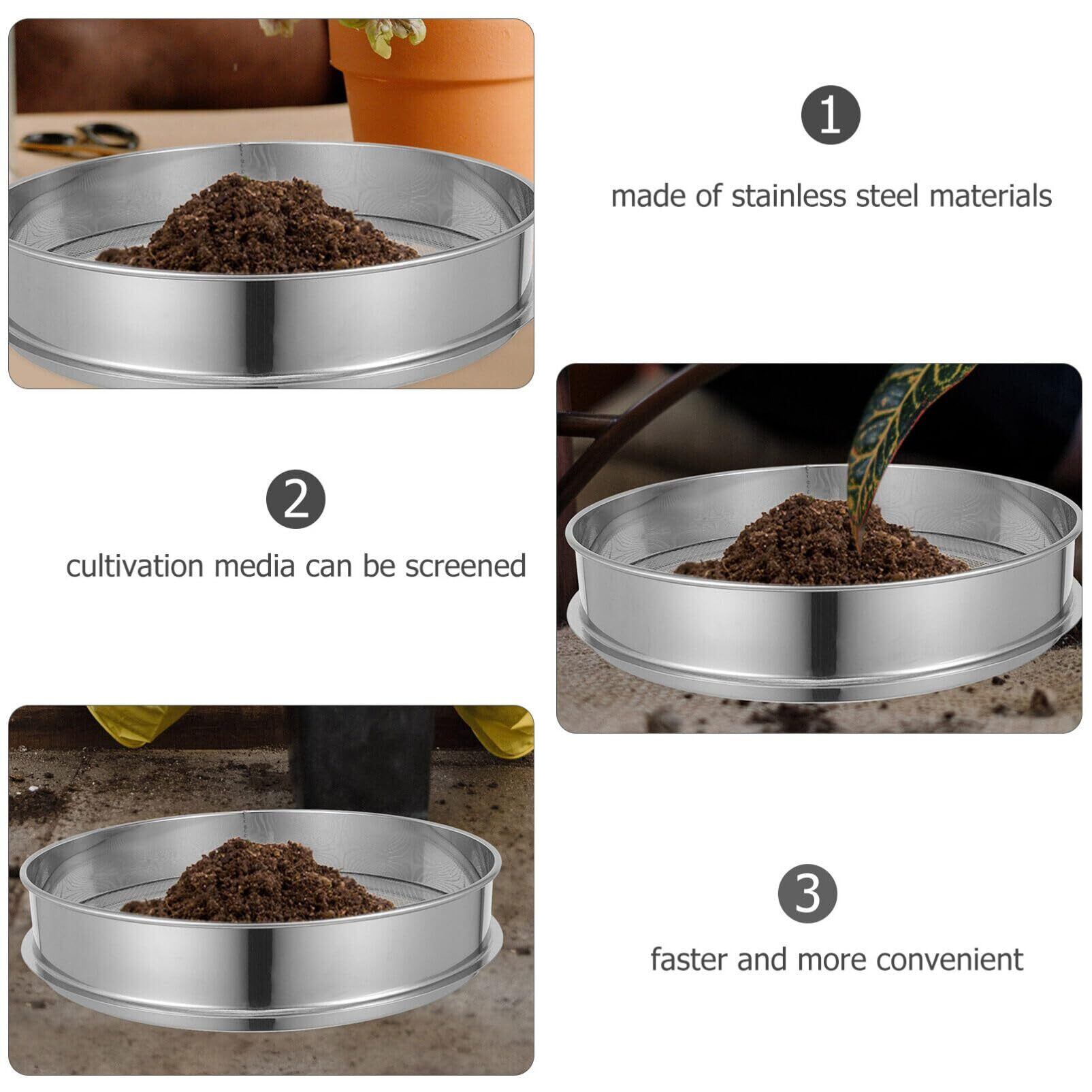 【土ふるい皿】ステンレス鋼ふるい皿土壌メッシュふるい岩ふるいツールステンレス鋼庭野菜ふるい器。メッシュふるいは掃除が簡単で、水で洗い流すことができるため、頻繁にふるいにかける必要がある庭師にとって実用的な選択肢です。