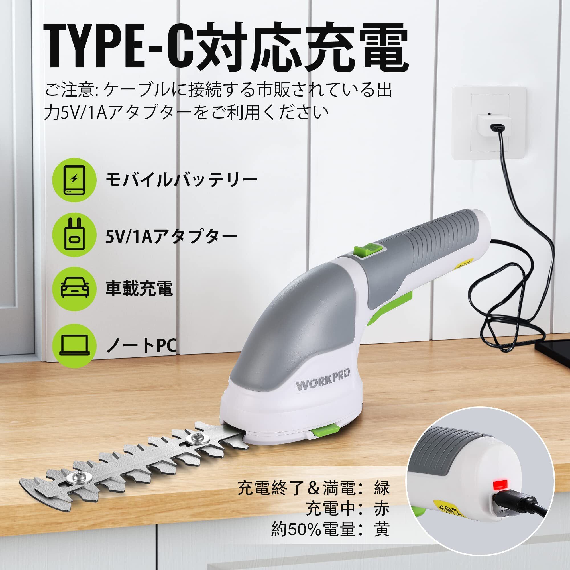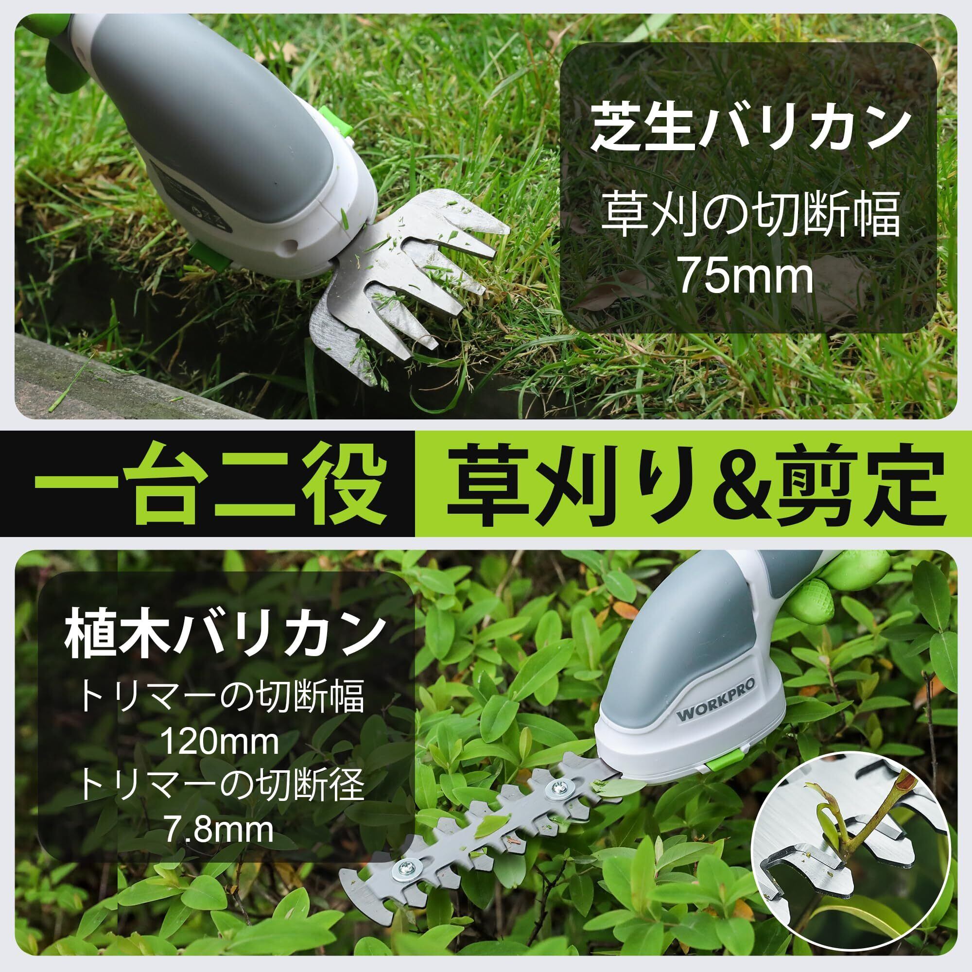 【2022最新】安全ボタン進化WORKPRO 芝生バリカン ガーデンバリカン 生垣バリカン 芝刈り機 一台二役 コードレス 3.6V充電式 Type-C充電ポート 二重安全ロック ブレード2枚付 バリカン刈幅75mm トリマー刈幅120mm 最大開口7.8mm 剪定 植木 園芸 機種型番W159025 | bobo
