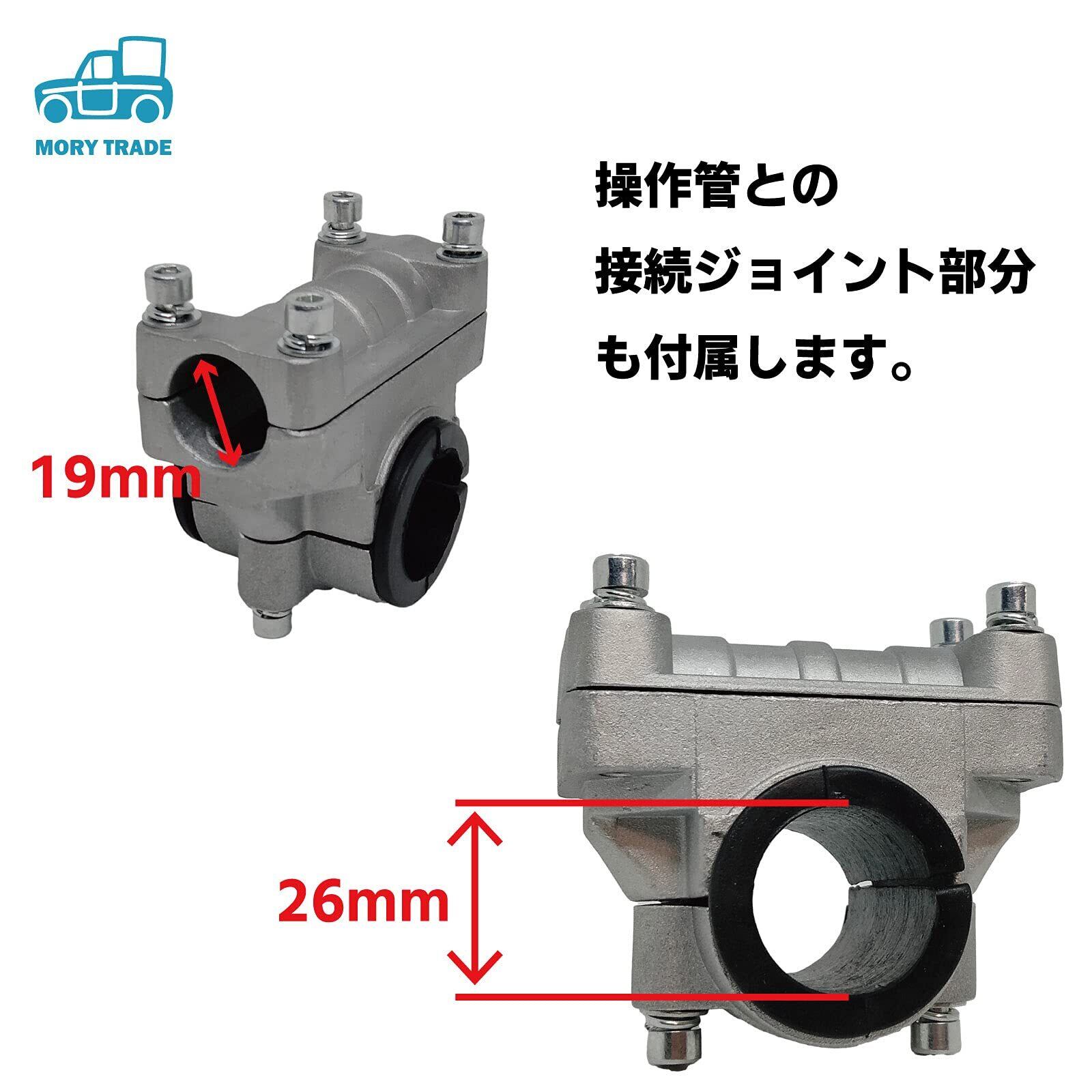 草刈機の操作管(メインパイプ)との取付金具も付属します。メインパイプ取付径は26mm、両手ハンドル部の径は19mm