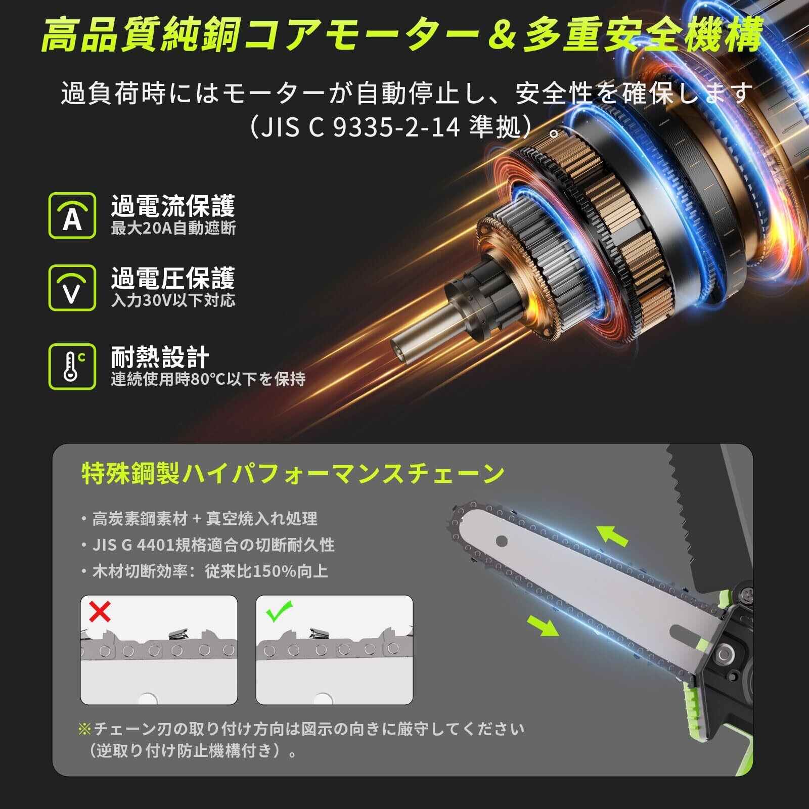 【高効率ブラシレスモーターを搭載したチェーンソー】 ブラシレスモーターを採用した充電式チェーンソーは、強力で効率的な切断が可能です。木材、竹、枝などを簡単に切断できます。過電流保護、過熱保護、充電保護などのインテリジェントな保護機能を提供して、作業中の安全を保護できます。