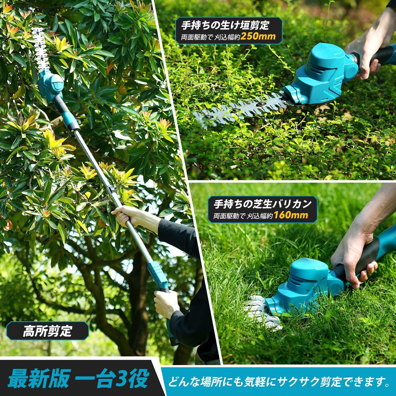 【1 台で 3 役こなすガーデンツール】新登場のポールヘッジトリマーは、画期的な着脱伸縮式デザインを採用しており、ヘッドを簡単に切り替えるだけで、3 種類のガーデン作業が可能です!この 3WAY セットには、高枝用のポールヘッジトリマー、手持ち充電式ヘッジトリマー、そして電動芝生バリカンが含まれており、あらゆる庭のニーズに対応します。1 台で 3 つの機能を兼ね備えたこのセットを使えば、高枝切りはもちろん、どんな場所でもスムーズに剪定作業ができます。園芸や庭の手入れ作業をもっと効率的に、そしてもっと楽しく行いましょう!