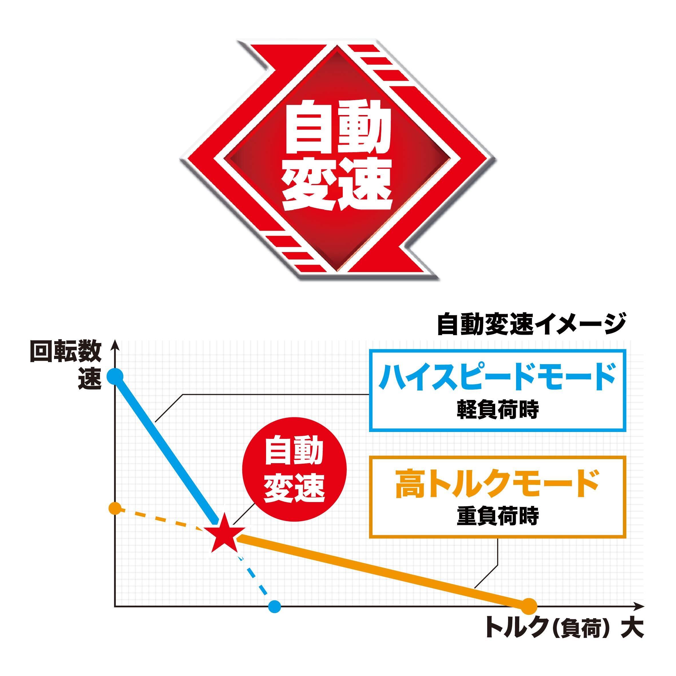 負荷に合わせて自動変速。軽負荷時は高速回転、重負荷時は高トルクに自動で切替。