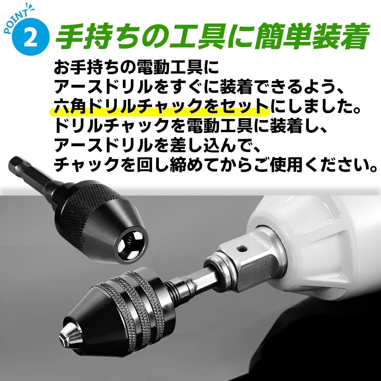 【手持ちの工具に簡単装着】お手持ちの電動工具にアースドリルをすぐに装着できるよう、六角ドリルチャックをセットにしました。ドリルチャックを電動工具に装着し、アースドリルを差し込んで、チャックを回し締めてからご使用ください。