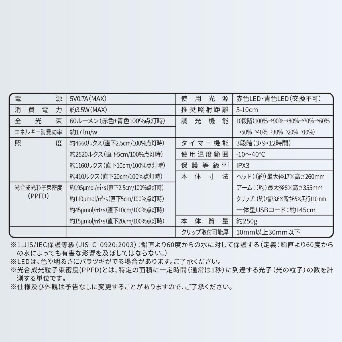 【 仕 様 】 ◆電源:5V 0.7A(MAX) ◆消費電力:約3.5W(MAX) ◆全光束:60ルーメン(赤色+青色100%点灯時) ◆エネルギー消費効率:約17 lm/W ◆照度:約4660ルクス(直下2.5cm/100%点灯時)、約2520ルクス(直下5cm/100%点灯時)、約1160ルクス(直下10cm/100%点灯時)、約410ルクス(直下20cm/100%点灯時) ◆光合成光粒子束密度(PPFD) :約195µmol/m2・S(直下2.5cm/100%点灯時)、約110µmol/m2・S(直下5cm/100%点灯時)、約45µmol/m2・S(直下10cm/100%点灯時)、約15µmol/m2・S(直下20cm/100%点灯時) ◆使用光源:赤色LED・青色LED(交換不可)