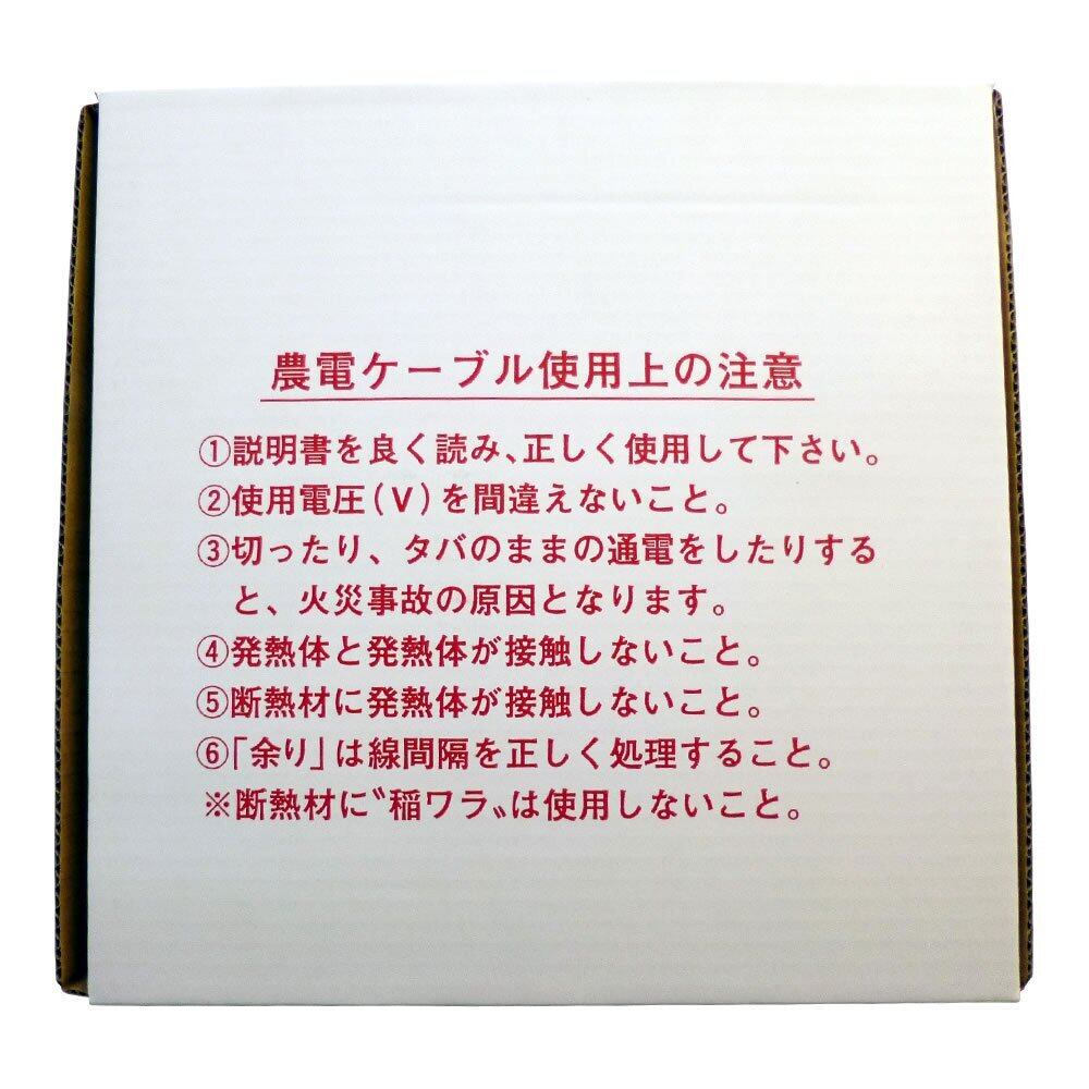 農電ケーブルは通電することによって発熱し「床土」や「本圃」を手軽に必要な温度にすることができます。 「踏み床」などでは温度管理が大変ですが農電温床にすれば、希望する場所で希望する温度を希望する時間だけ得られます。 作物を栽培するとき「苗半作」と言います。 地温の確保しにくい冬場の育苗でも農電ケーブルを使用すれば栽培者の意図どおりの地温が得られ「根張りのいい」立派な苗を仕立てることができます。 安全です。 長年の技術とノウハウで育苗床/本圃/水耕栽培など、電気的条件の良くないところでも安心してご使用いただけます。 簡単です。 温湯を利用したベッドヒータなどと違い工事不要です。農電温床は通常の「育苗ベッドを作る材料」+「農電ケーブル」それだけです。 また、サーモスタットを併用することにより、わずらわしい感度管理を自動化することができます。 規格:三相200V、500W サイズ:60m 約2坪用
