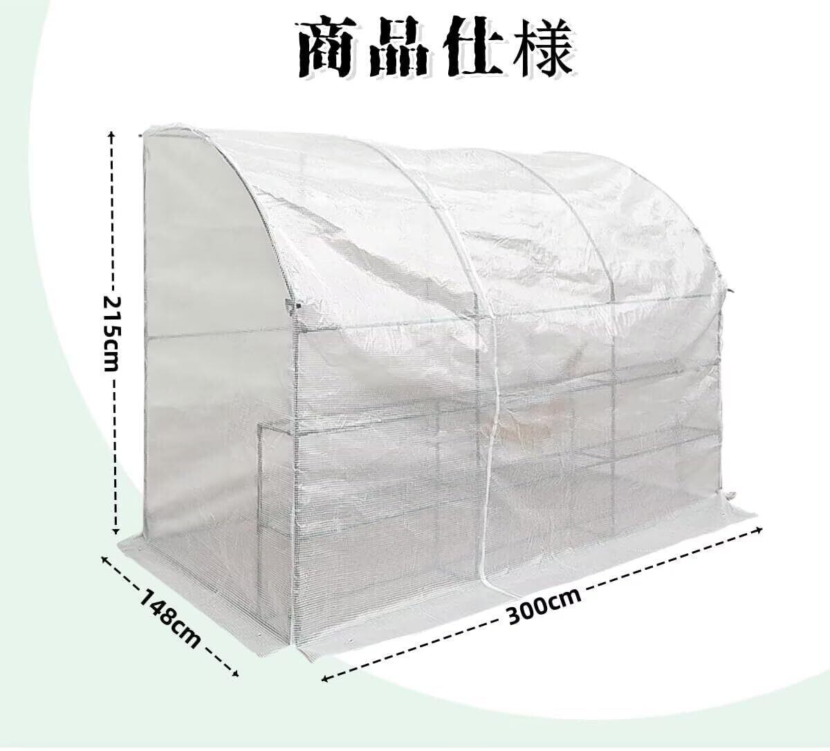【商品仕様】サイズ:幅300cm×奥行147.5cm×高さ215cm;本体の重量:約15kg;フレーム材質:鉄。これは360°完全に密閉された温室 ビニールハウス 家庭用ため、植物や花がより多くの日光を吸収し、成長するための十分なスペースを提供します。