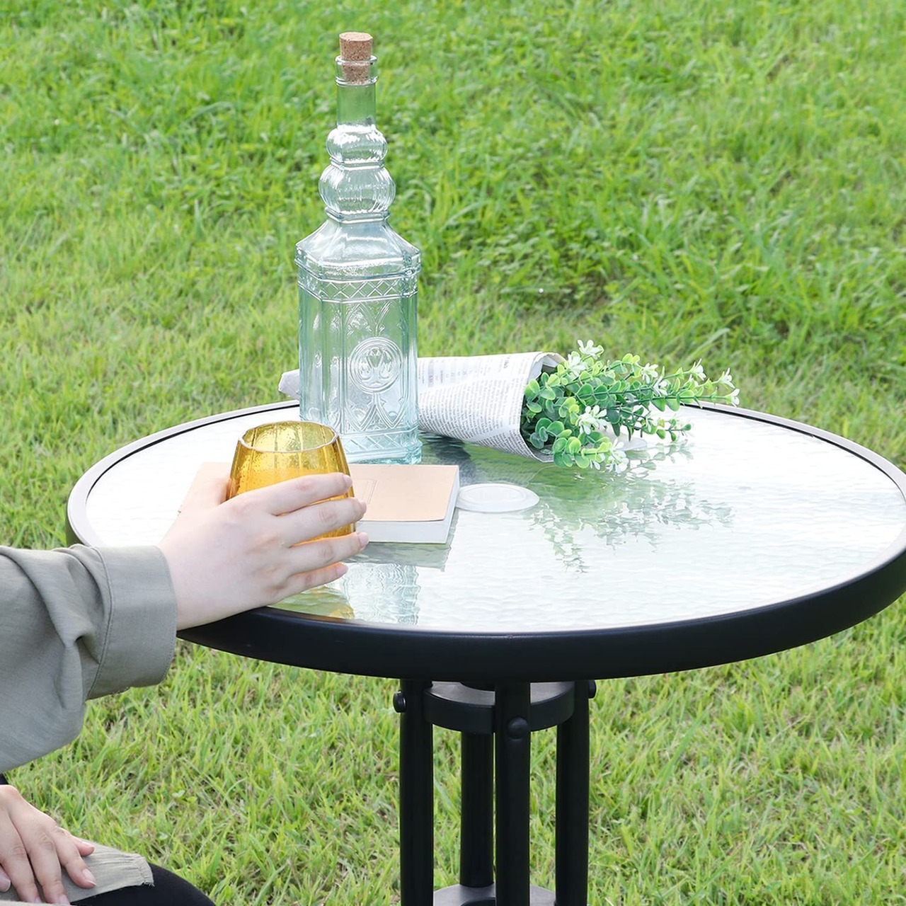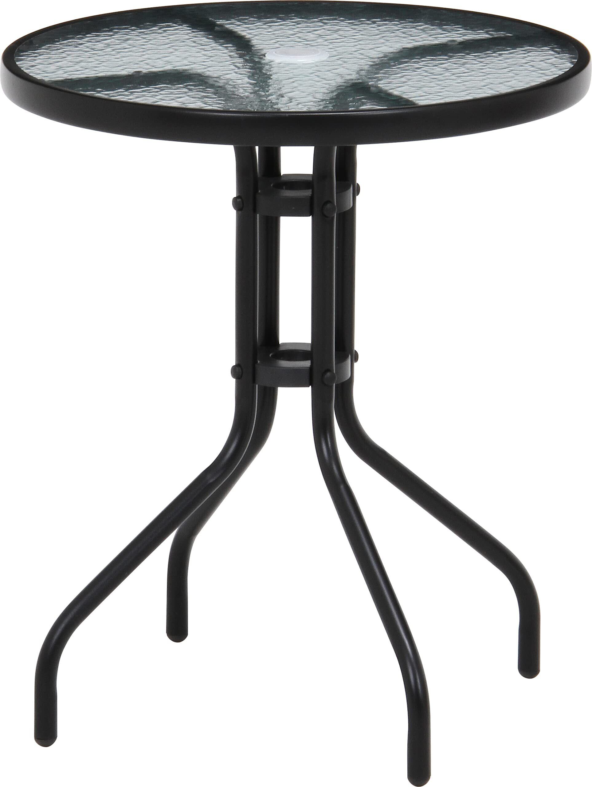 スチールのフレームと強化ガラスの天板の組み合わせがおしゃれなガーデンテーブル。