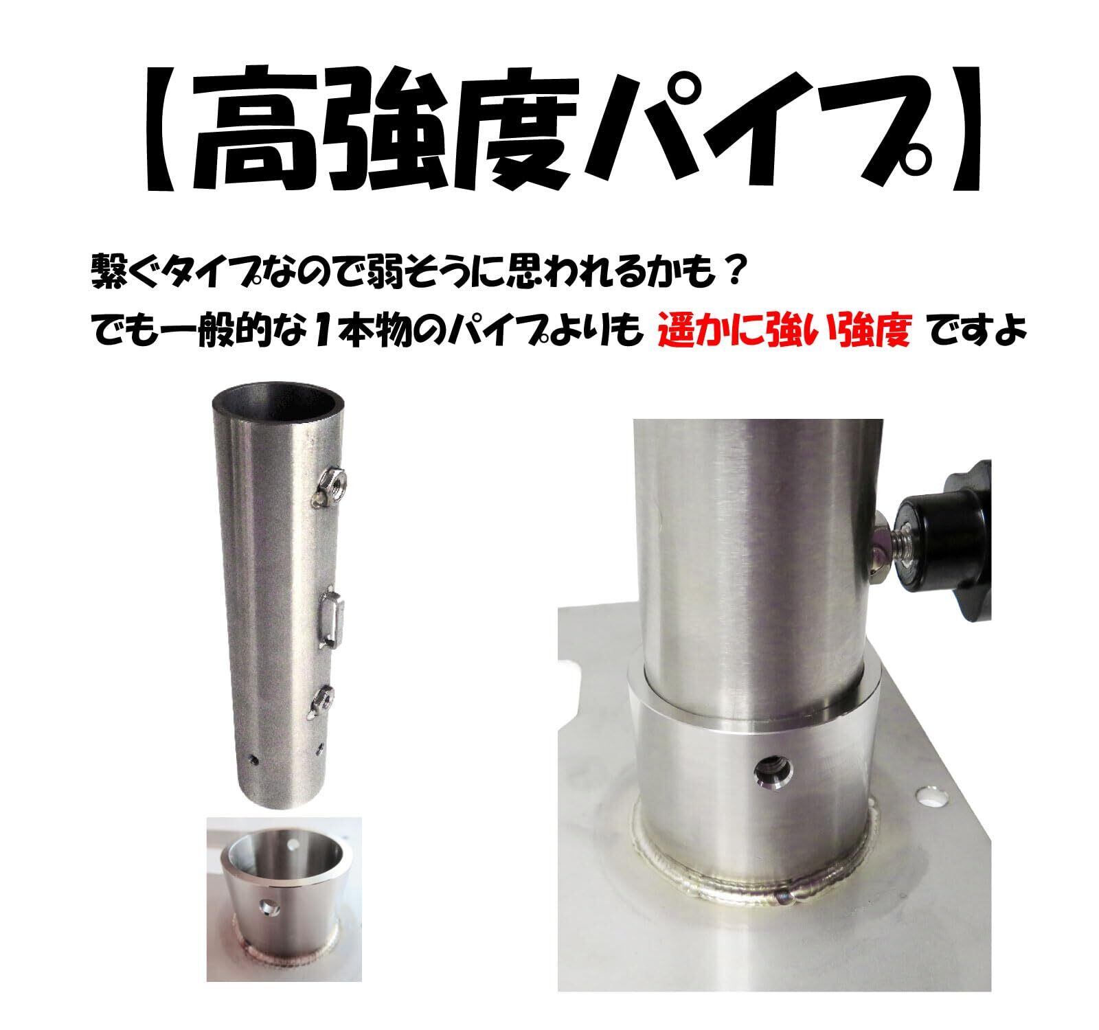 超・強靭! 着脱式ですが1本物のパイプより『確実に強い』です! 突風で煽られても、この繋ぎ合わせ部分が抜けてしまったり、曲がってしまったりする事はありません。一般的に市販(ハンドメイドも含め)されているスタンドパイプより強くなっていますのでご安心ください。