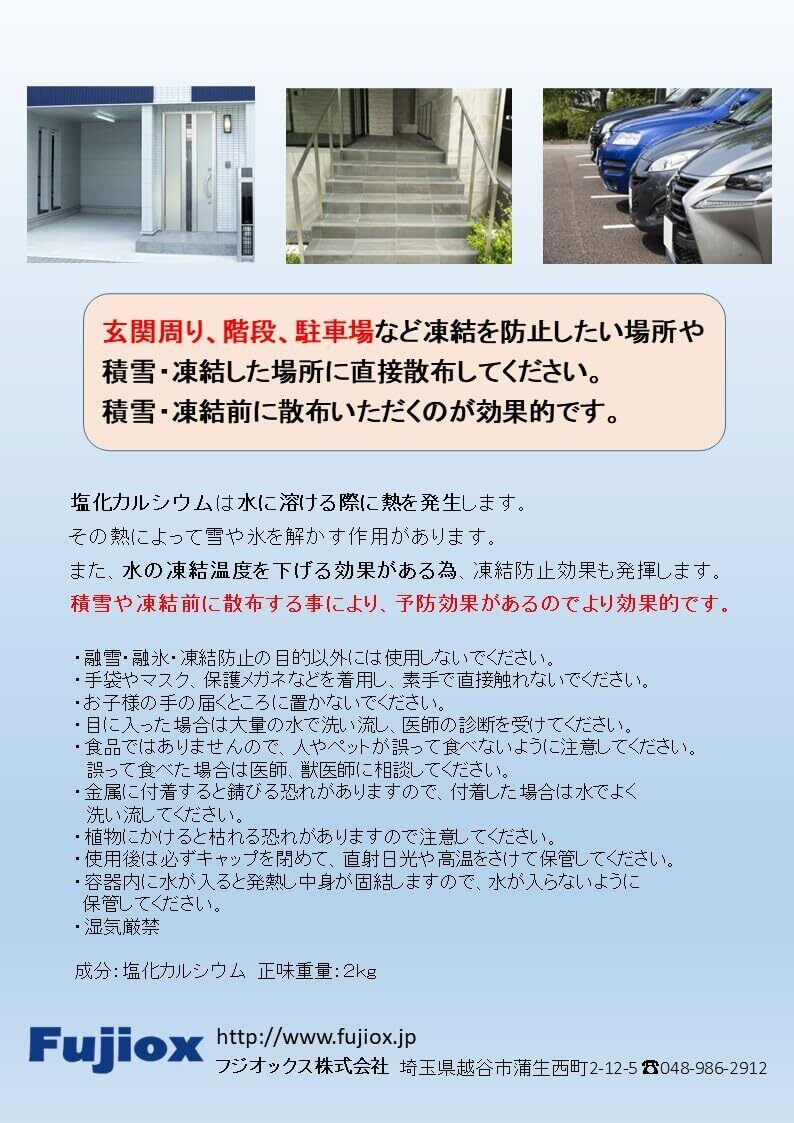 ※玄関周り、階段、駐車場など凍結を防止たい場所や積雪・凍結した場所に直接散布してください。 ※ 積雪・凍結前に散布いただくのが効果的です。※散布することで、塩化カルシウムによる凝固点低下と溶解熱によって、氷面がシャーベット状に変化します。 ※原材料費の高騰により、容器形状と内容量を2kgから1.8kgへ変更させていただいております。在庫状況により旧タイプ(2kg)をお届けする場合がございますが、商品の中身は変わりございません。