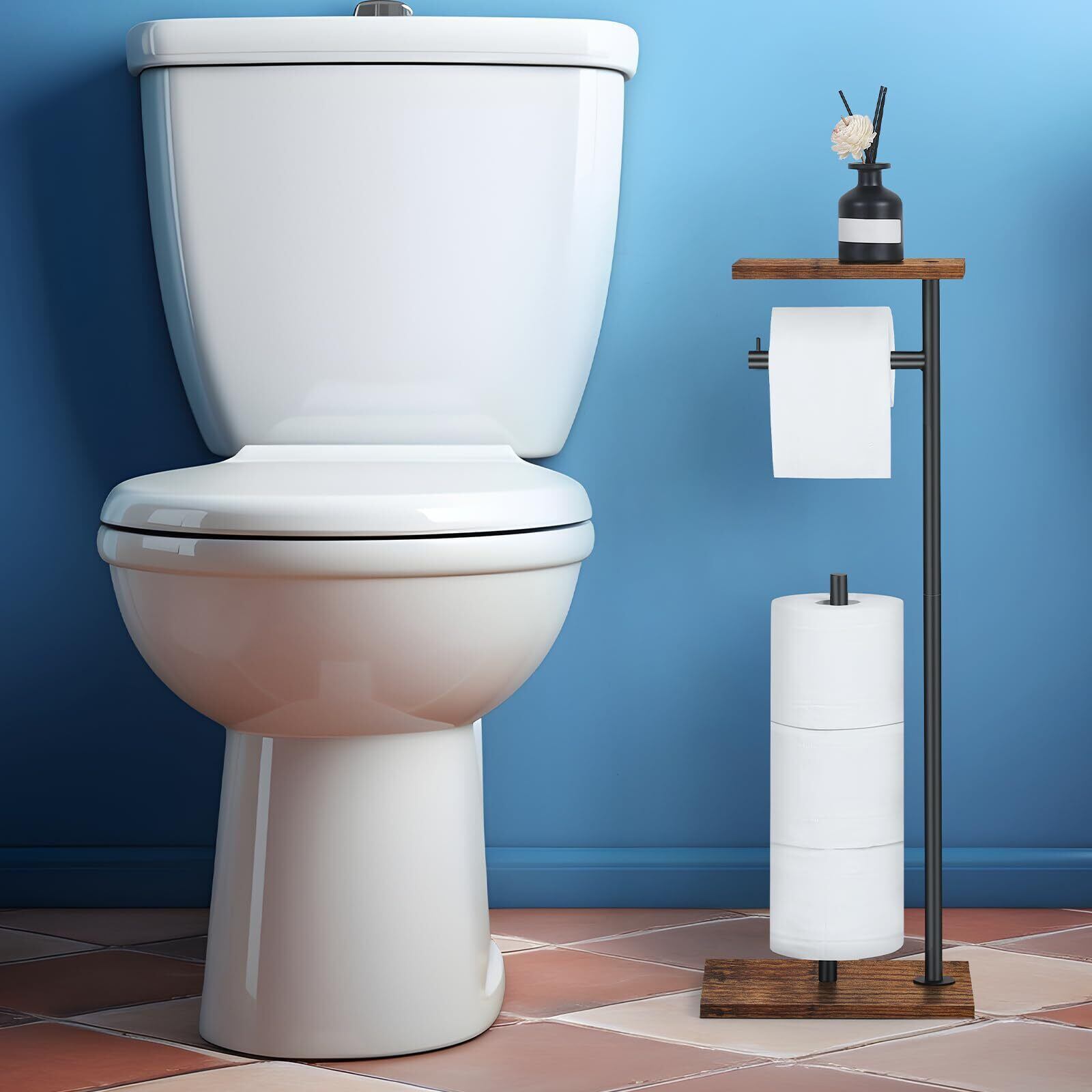 【大容量】自立式トイレットペーパーホルダーは、ペーパータオルを一度に4ロール収納でき、大容量で、トイレットペーパーの補充が間に合わない心配はありません、トイレットペーパーホルダーの上には木製のボードがあり、携帯電話やアロマテラピー、ウェットティッシュなどを収納でき、トイレをすっきりさせる