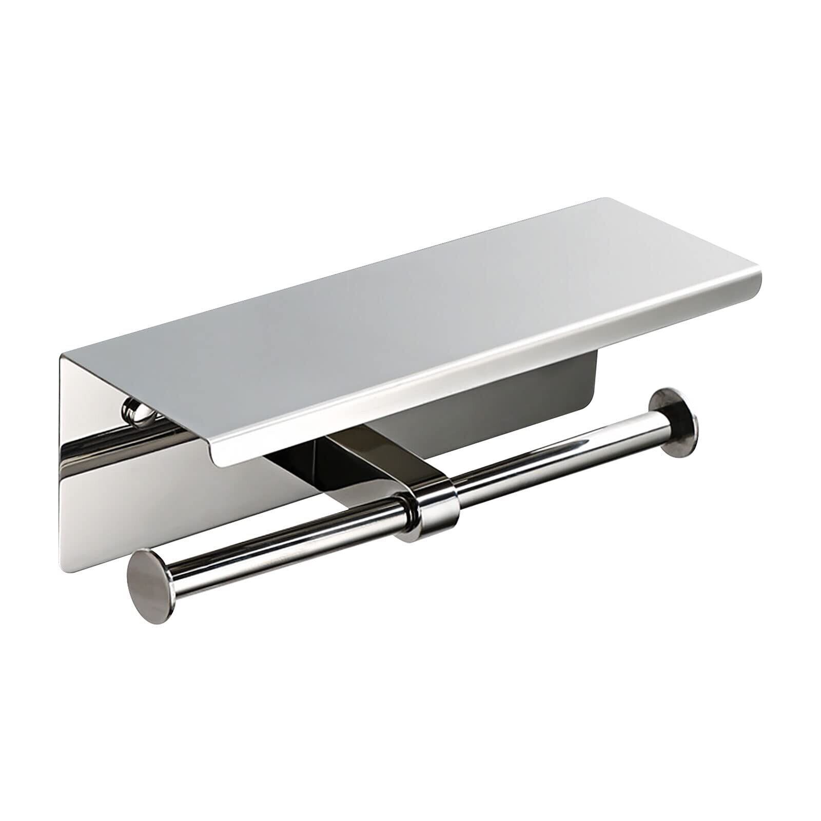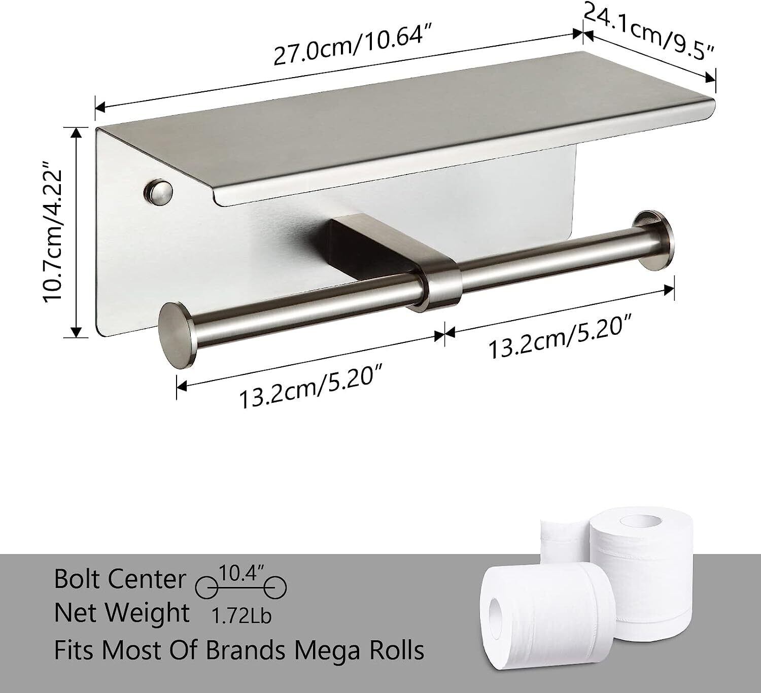 WXVOVXW トイレットペーパーホルダー 2連 トイレっとペーパーホルダー ペーパーホルダー トイレ 棚付き2枚紙巻き スマホや小物などが置ける棚板付き 太巻き 芯なし 対応 簡単設置 工事不要 マンション 戸建て 賃貸 インテリア DIY ステンレス製ダブルペーパーローラー 棚板付き 27cm幅 ネジ付き (シルバー 2連)