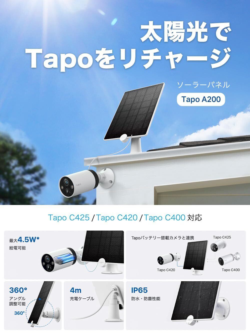 TP-Link Tapo フルワイヤレス ネットワークカメラ専用 ソーラーパネル【Tapo C425/C420S2/C420S1/C420 用】 Tapo A200